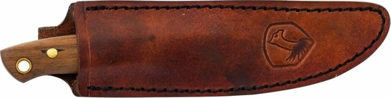 Mânerul din lemn de nuc se așază bine în palmă, oferă o priză sigură și are la capăt un orificiu pentru șnur. Pentru purtare sigură, pachetul include o teacă din piele de calitate, care protejează lama și permite purtarea comodă la curea.