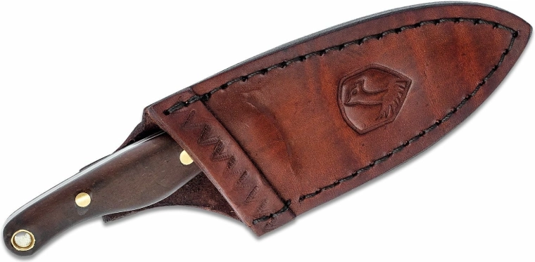 Vârful rotunjit sporește siguranța în timpul utilizării, aspect apreciat de începători și de utilizatorii mai tineri sub supraveghere. Mânerul profilat din lemn de nuc se potrivește excelent în mână, plăselele nituite asigură stabilitate, iar orificiul pentru șnur permite o buclă de siguranță sau agățare. Finisajul natural oferă lamei durabilitate și un aspect autentic, în timp ce teaca din piele permite purtare sigură la curea.