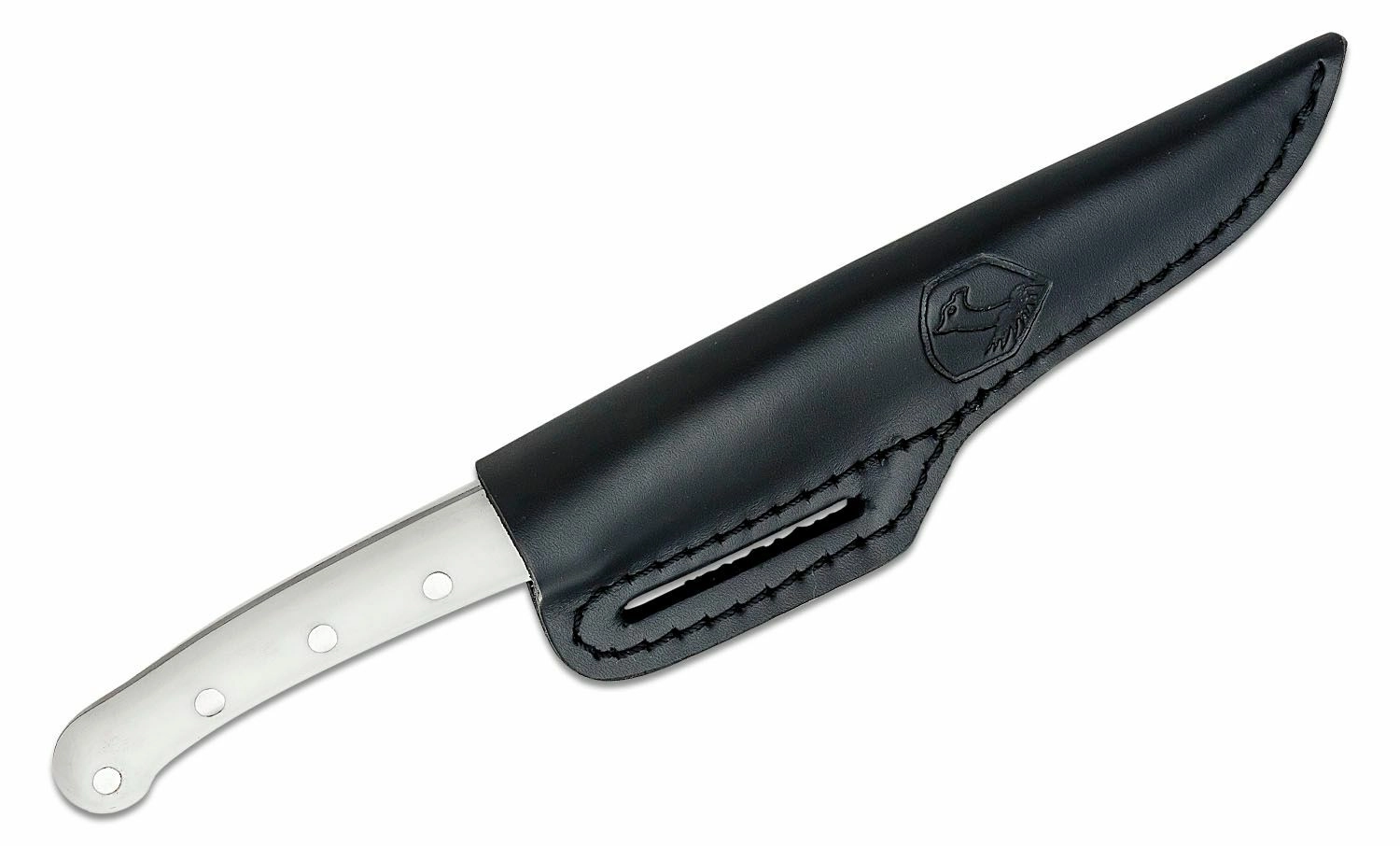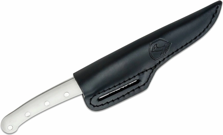 Mânerul ergonomic alb, din material rezistent Micarta, oferă o priză sigură chiar și pe umed, iar fixarea prin nituire sporește durabilitatea generală. Cuțitul este livrat cu o teacă din piele pentru purtare sigură și comodă la curea.