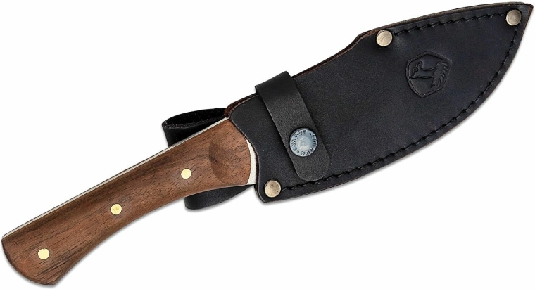 Oțelul 440HC oferă un echilibru reușit între rezistența la coroziune, menținerea muchiei ascuțite și ușurința la ascuțire. Mânerul ergonomic din lemn de nuc asigură o prindere sigură și confortabilă chiar și în utilizare prelungită. Teaca din piele, de culoare închisă, permite depozitarea și purtarea în siguranță la curea.