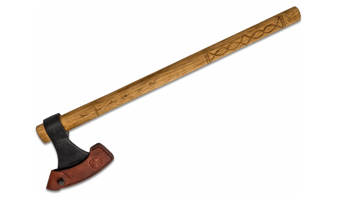 Coada lungă din hickory american oferă priză fermă, pârghie excelentă și siguranță la fiecare aruncare – cu detalii runice de efect.