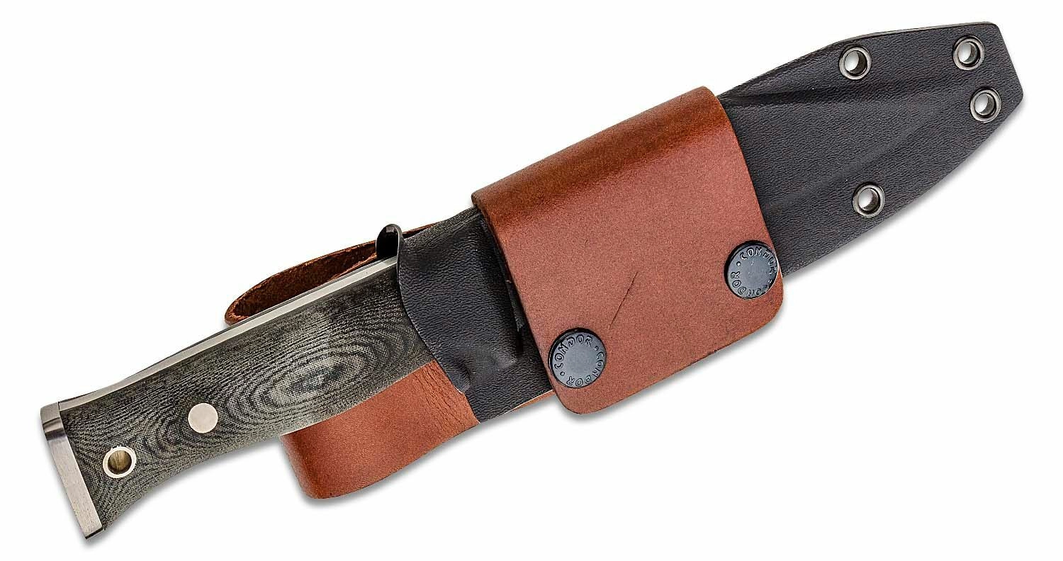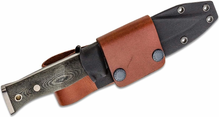Mânerul din Micarta cu textură, în culoare negru-gri, oferă priză sigură chiar și cu mănuși și la capăt dispune de pinten pentru lovire și spargere a sticlei. Construcția full-tang pe toată lungimea sporește rezistența la batoning și la sarcini mai grele. Cuțitul vine cu o teacă combinată Kydex + piele pentru purtare sigură și versatilă.