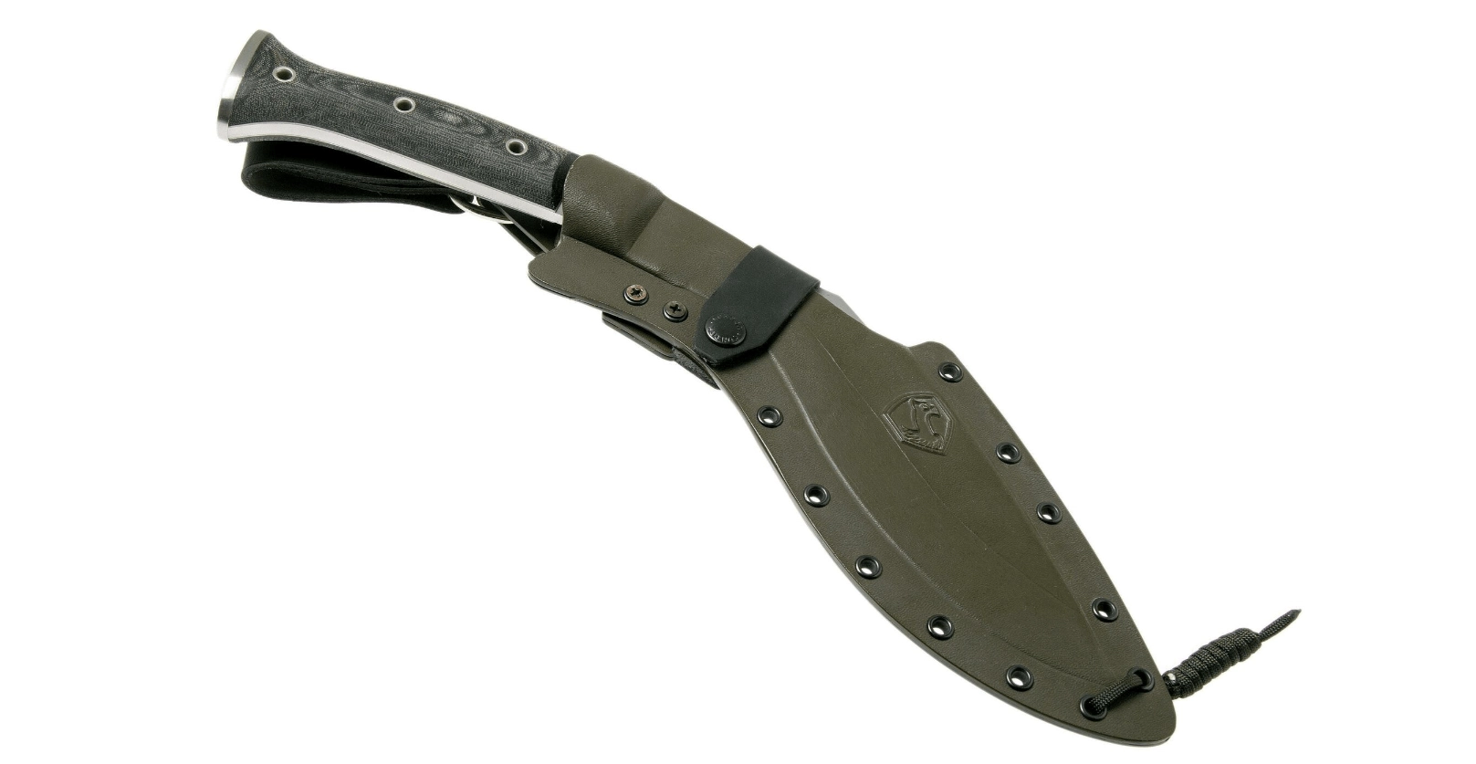 Mânerul durabil din Micarta, în finisaj army green, este ergonomic și lărgit în partea din spate pentru o priză mai sigură la lovituri puternice. Nitul gol de la capăt permite trecerea unei laniere de siguranță pentru un plus de protecție. Pachetul include o teacă Kydex modelată cu precizie pentru purtare fermă și silențioasă.