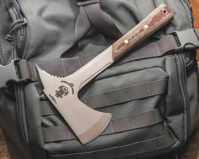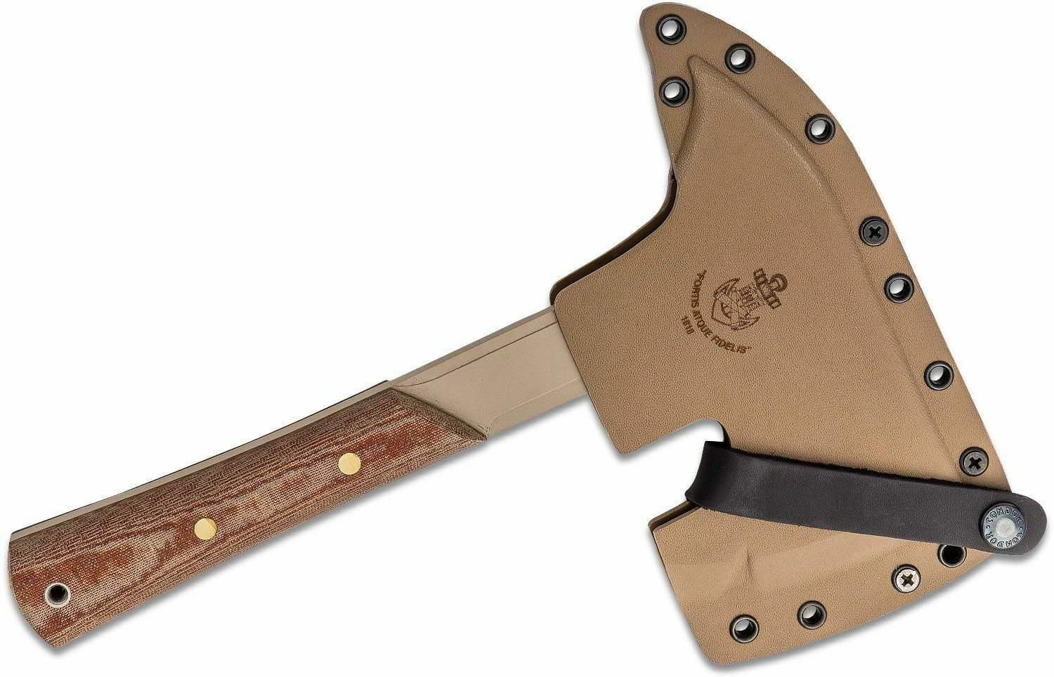 Mânerul din Micarta maro oferă o prindere sigură în orice vreme, iar la capăt are orificiu pentru șnur pentru asigurare sau agățare. Securea este livrată cu un toc Kydex solid, cu buclă/prinderi pentru purtare sigură și acces rapid.