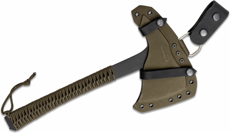 În pachet se găsește tocul din kydex 710 Custom Sheaths, care permite fixare sigură și variabilă pe curea, rucsac sau echipament tactic. Datorită greutății bine echilibrate de 817 g, tomahawk-ul este ușor de controlat și potrivit atât pentru lucru, cât și pentru aruncări de antrenament.