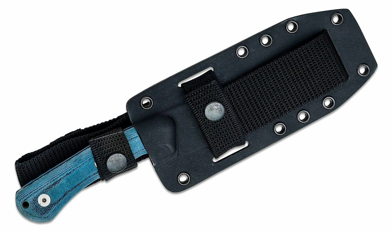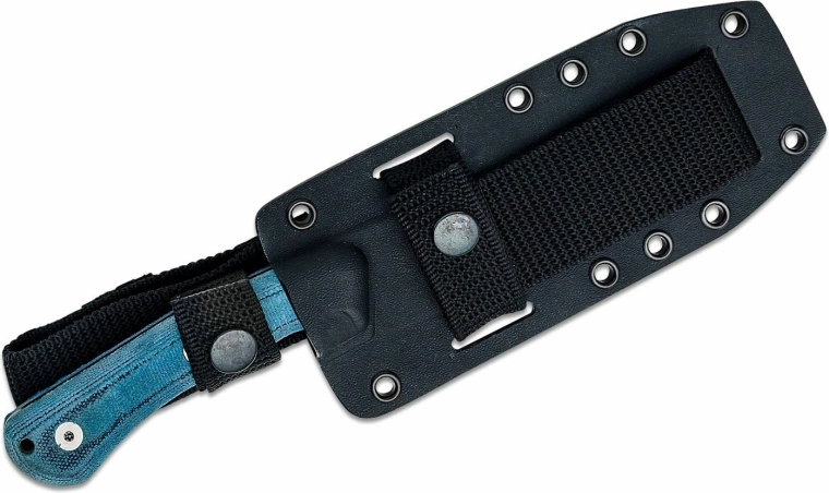 Mânerul din Micarta albastră, cu textură aderentă, asigură prindere sigură și confortabilă chiar și când este ud. Orificiul pentru șnur permite fixare de siguranță. Pachetul include o teacă rezistentă din Kydex, compatibilă cu sistemul MOLLE, pentru purtare flexibilă pe echipament sau pe curea.