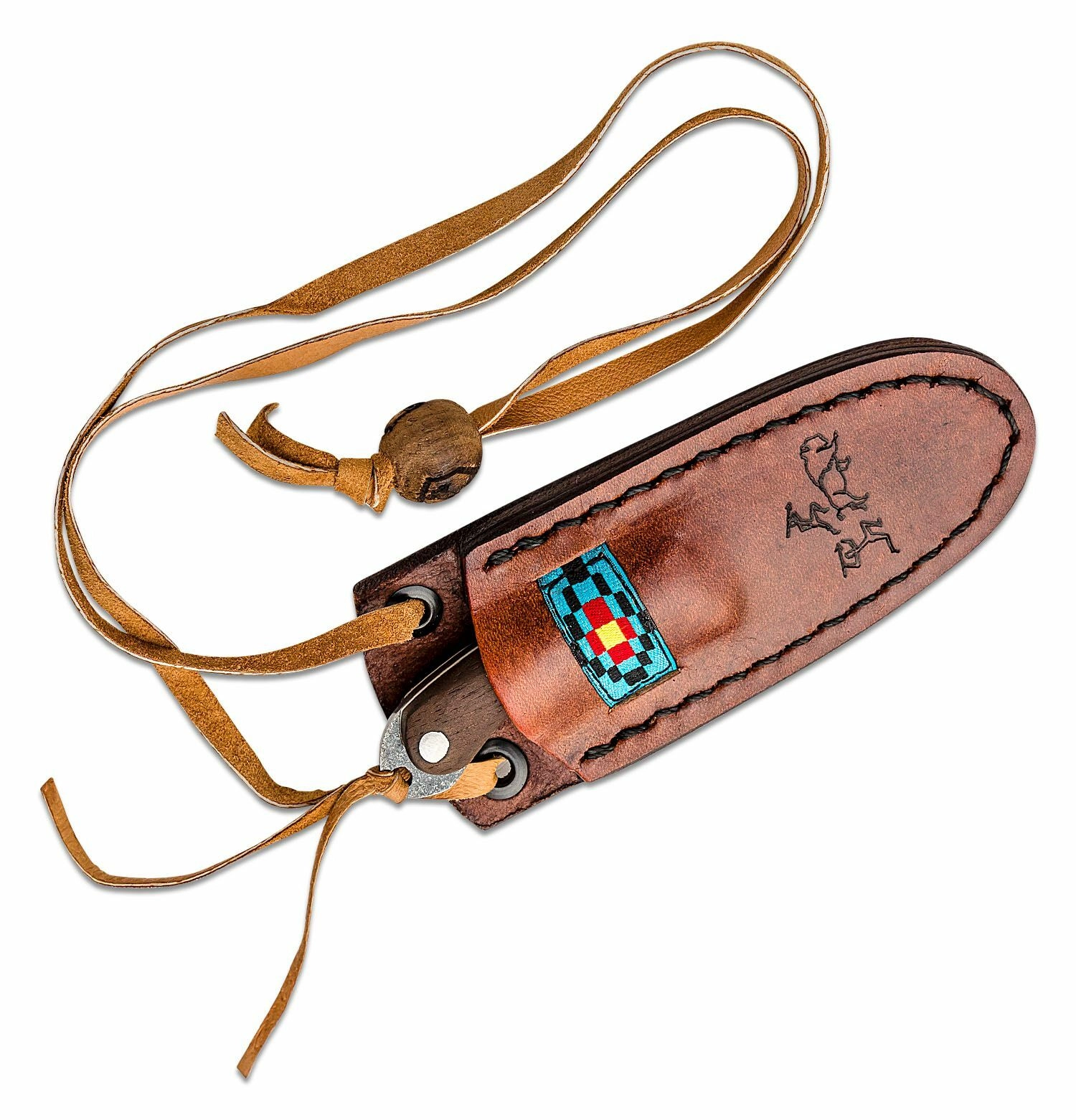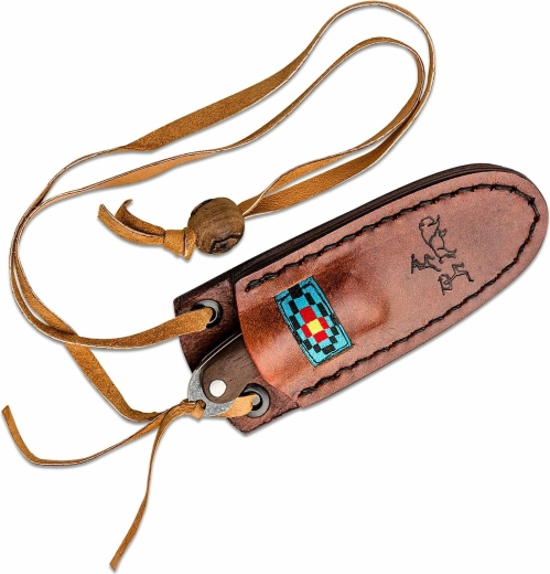Mânerul din lemn de nuc completat de piatră turcoaz oferă o priză confortabilă și sigură chiar și în condiții nefavorabile. Cuțitul este livrat cu o teacă din piele decorată cu motiv de vânătoare și șnur, care permit purtarea sigură și stilată la gât.