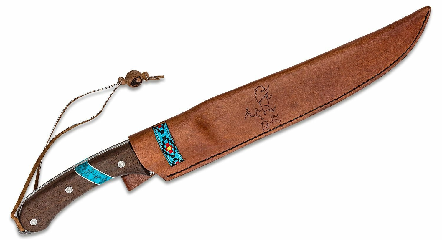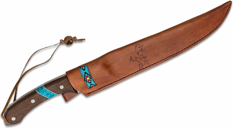 Mânerul din lemn de nuc rezistent, completat de un element turcoaz, se potrivește excelent în palmă și oferă o priză sigură. Ochetul pentru șnur crește siguranța în timpul lucrului. Teaca din piele, cu decor tradițional, permite purtare comodă și stilată.