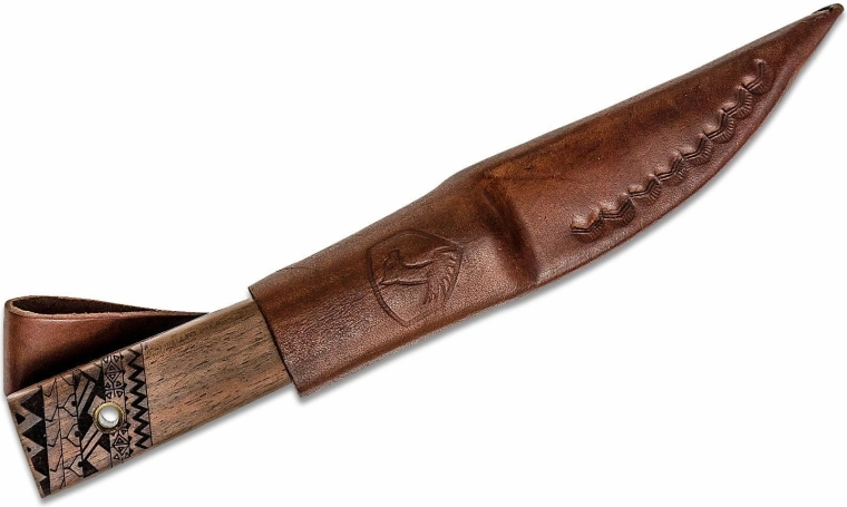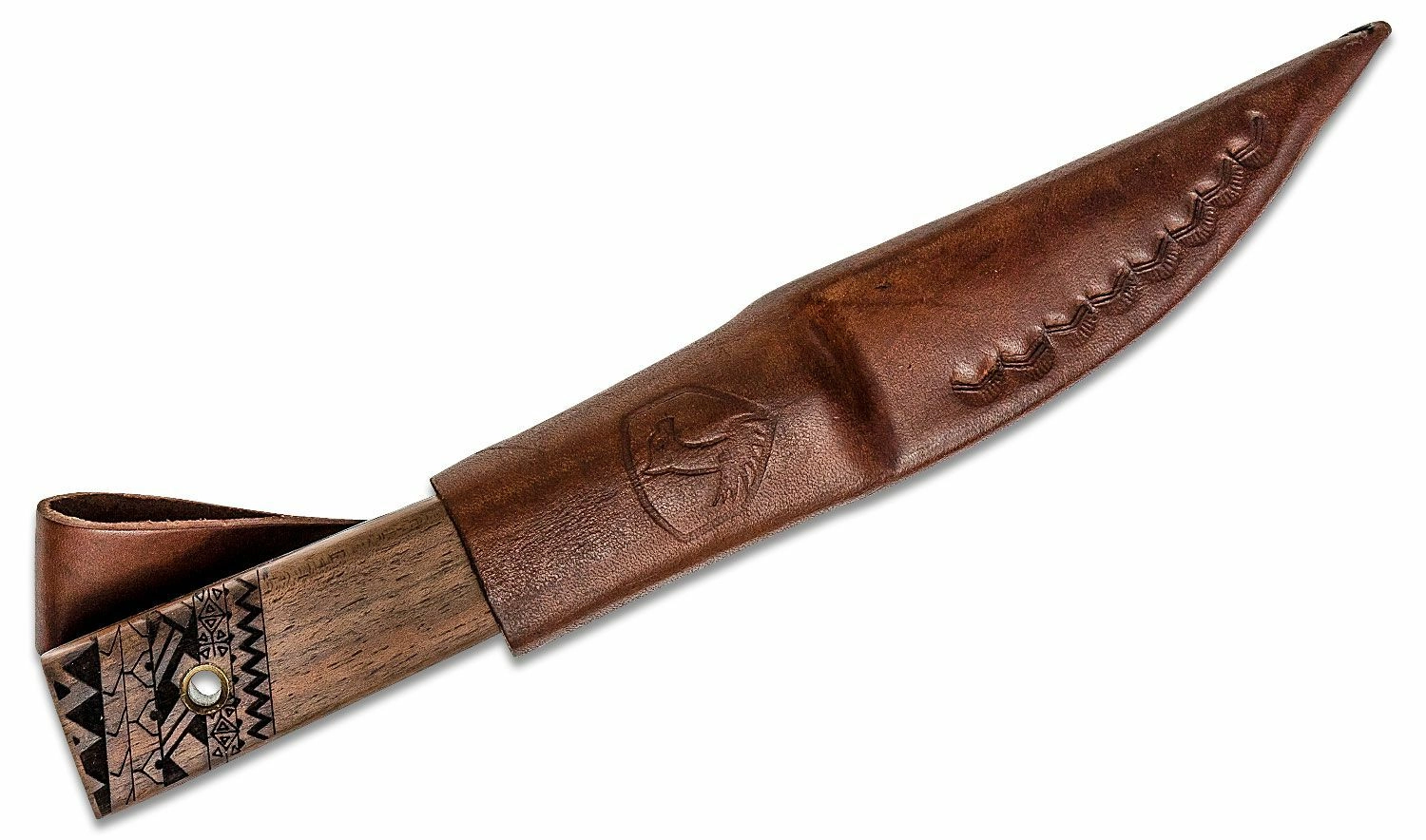 Mânerul din lemn de nuc se potrivește excelent în mână, iar înfășurarea din alamă oferă nu doar un aspect atrăgător, ci și o priză mai sigură. Capătul cu detalii sculptate și orificiul pentru șnur adaugă funcționalitate și estetică. Pachetul include o teacă din piele de calitate pentru purtare sigură la brâu.