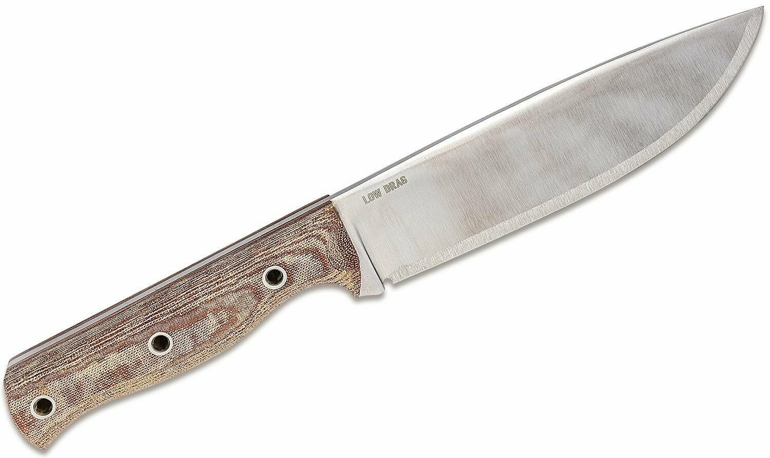Mânerul maro din Micarta cu textură pronunțată și formă ergonomică stă sigur în mână atât uscat, cât și ud. Oțelul 1075 este un carbon tenace – pentru durată de viață îndelungată este suficient ca după utilizare lama să fie curățată și ușor unsă cu ulei.