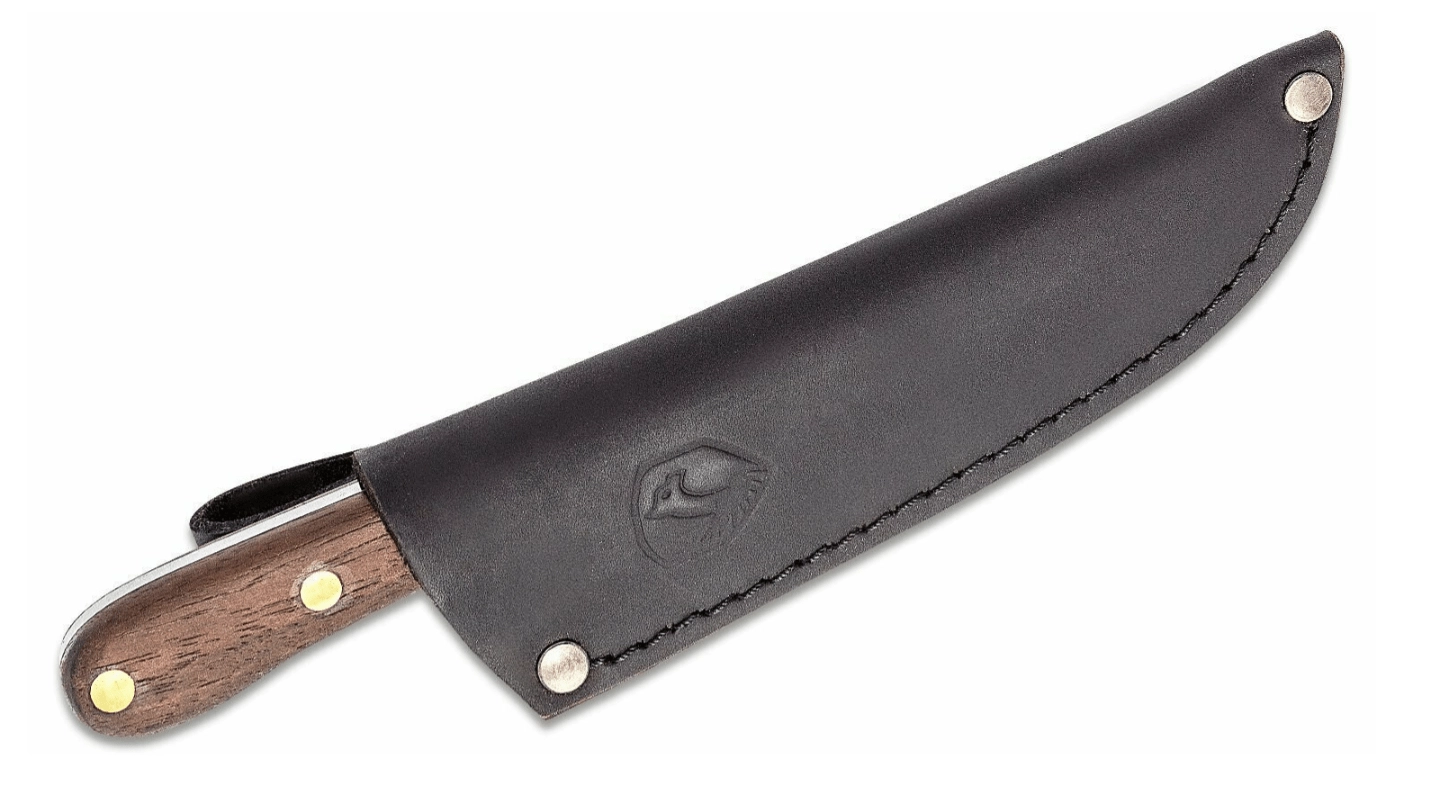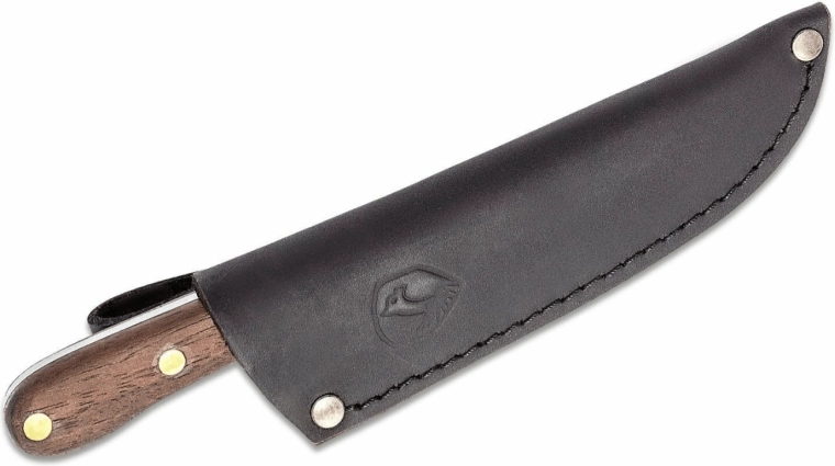 Elegantul mâner din lemn de nuc se așază sigur în palmă și oferă un control excelent al tăieturii. Pachetul include o teacă din piele pentru purtare sigură și stilată la curea – alegerea ideală pentru oricine dorește un cuțit practic și durabil, fără greutate inutilă.