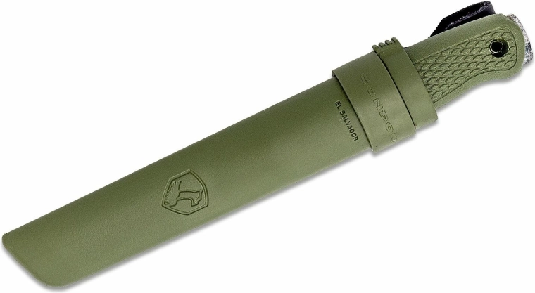 Mânerul ergonomic din polipropilenă, în culoare verde, se potrivește bine în mână chiar și cu mănuși și are la capăt un orificiu pentru șnur sau curea. Este inclusă o teacă rezistentă din polipropilenă, în culoare asortată, compatibilă cu modelul Bushglider, care poate fi purtată pe partea dreaptă sau stângă pentru confort maxim.