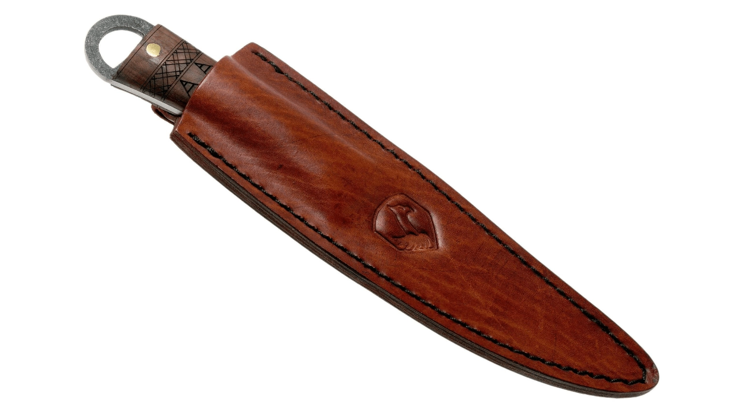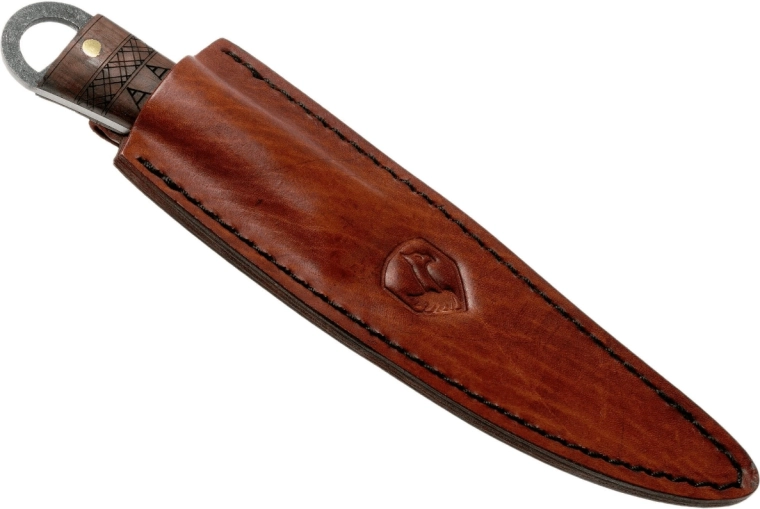 Mânerul din lemn de nuc de calitate, cu desen pronunțat, este fixat ferm de lamă prin trei nituri din alamă. La capătul mânerului se află un inel din oțel pentru atașarea unei sfori sau a unei bucle. Pachetul include un toc din piele, finisat cu grijă, pentru purtare sigură și stilată atât pe teren, cât și în colecție.
