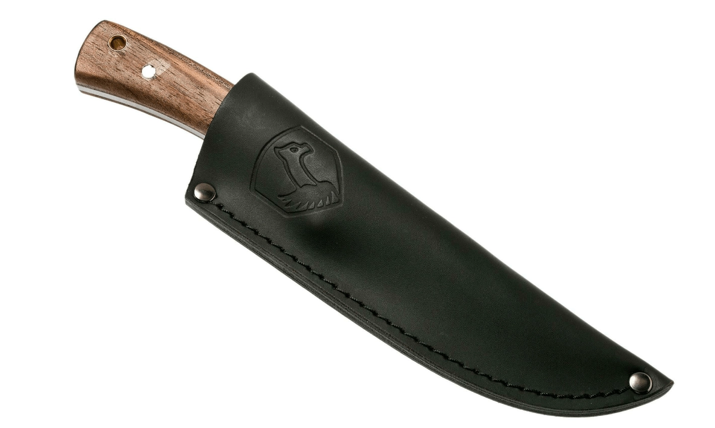 Mânerul ergonomic din lemn de nuc se potrivește excelent în mână și oferă siguranță la batoning, pregătirea alimentelor și lucrări mai fine. La capătul mânerului se află un orificiu pentru șnur util, pentru o securizare mai bună la purtare. Pachetul include o teacă din piele de calitate, în nuanță închisă, pentru depozitare sigură și elegantă.