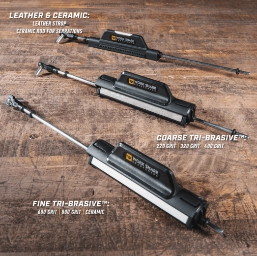 Două mânere ergonomice Tri-Brasive® oferă o gamă largă de abrazive pentru toate etapele îngrijirii tăișului: de la reparații și îndepărtare rapidă de material, la reascuțire precisă și până la lustruirea finală. Setul include plăci diamantate cu granulații 220, 320, 400, 600 și 800, placă ceramică fină și curea de piele pentru un finisaj oglindă. Pentru cuțitele zimțate servește tija ceramică, cu care refaci cu ușurință ascuțimea fiecărui dinte.