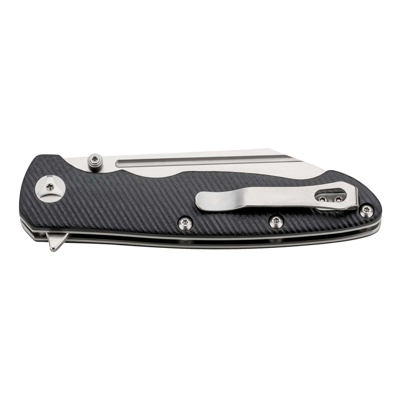 Mânerul ergonomic, texturat, din G10 negru, cu inserții din oțel, stă sigur în mână, iar decupajele pentru degete cresc controlul la tăiere. Linerlock asigură fiabil lama în poziție deschisă, iar clipsul de buzunar permite purtare discretă și confortabilă zi de zi.