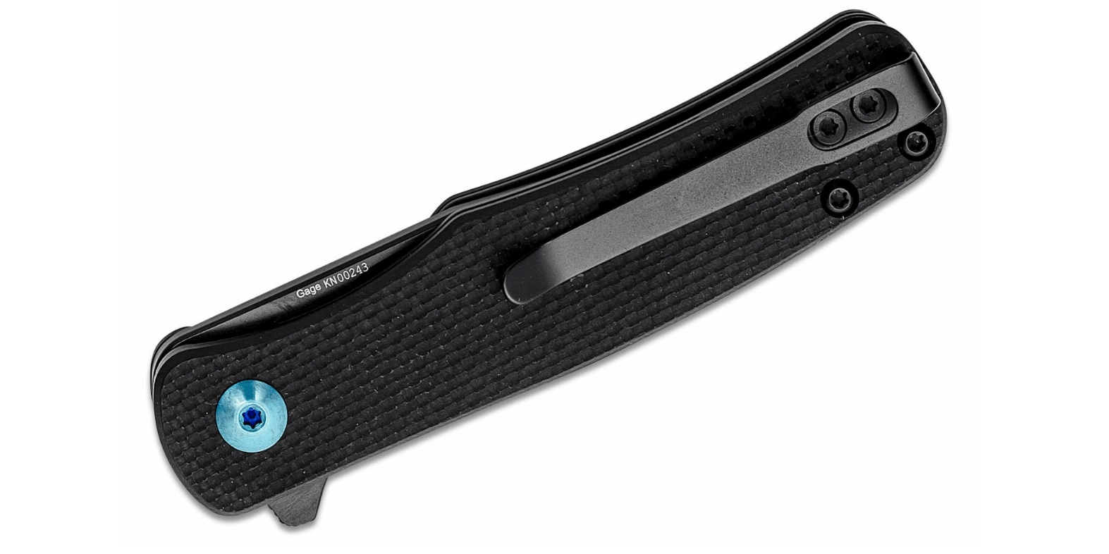 Mânerul din material G10 în elegantul negru este solid, antiderapant și plăcut conturat pentru o priză sigură. Datorită clemei integrate, cuțitul poate fi purtat ușor și discret în buzunar, pe curea sau pe marginea rucsacului.