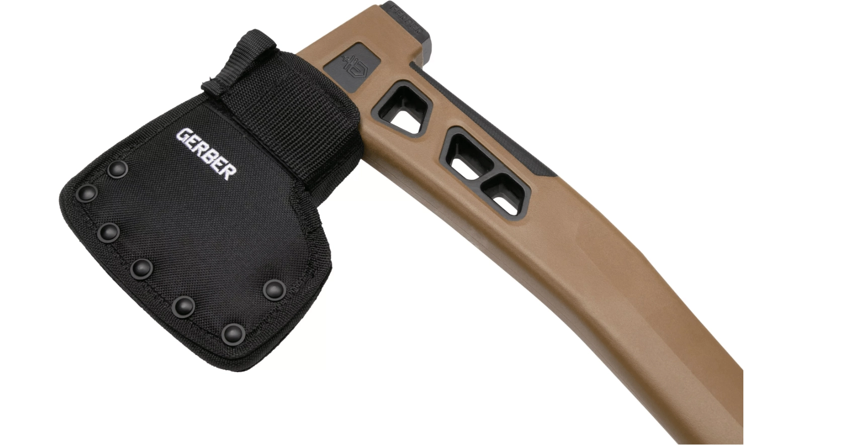 Securea bushcraft universală Gerber Bushcraft Axe Coyote, pentru camping și lucru în grădină, oferă oțel carbon durabil cu strat PTFE împotriva coroziunii, mâner din cauciuc antiderapant cu inserție GFN și spațiu de depozitare etanș în coadă pentru paracord, aprinzător sau amnar. Include toc din nailon pentru purtare în siguranță.