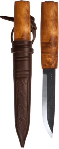 Cuțit de vânătoare versatil HELLE VIKING, inspirat de tradiția scandinavă, oferă o lamă solidă din oțel inoxidabil laminat cu teșitură scandinavă tradițională, un mâner ergonomic din lemn de mesteacăn de rădăcină și o teacă din piele de calitate pentru purtare în siguranță.
