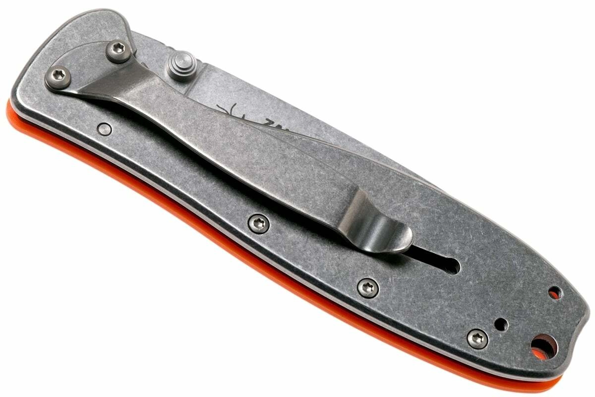 Mânerul portocaliu texturat din FRN asigură o prindere sigură chiar și cu mănuși, iar greutatea redusă este ideală pentru purtare EDC. Clema practică de buzunar este reglabilă în două poziții, iar orificiul pentru șnur extinde opțiunile de fixare.