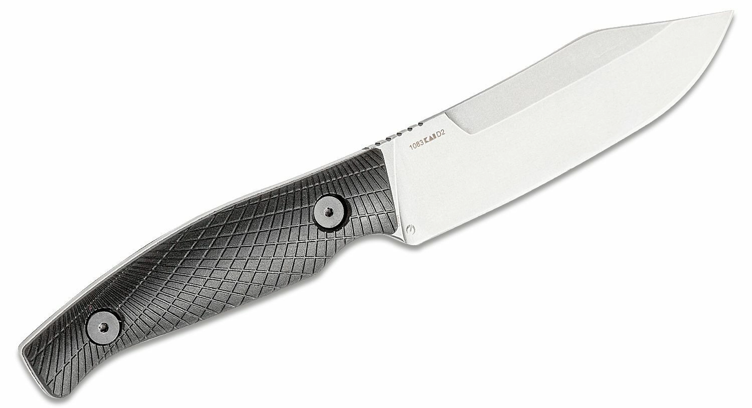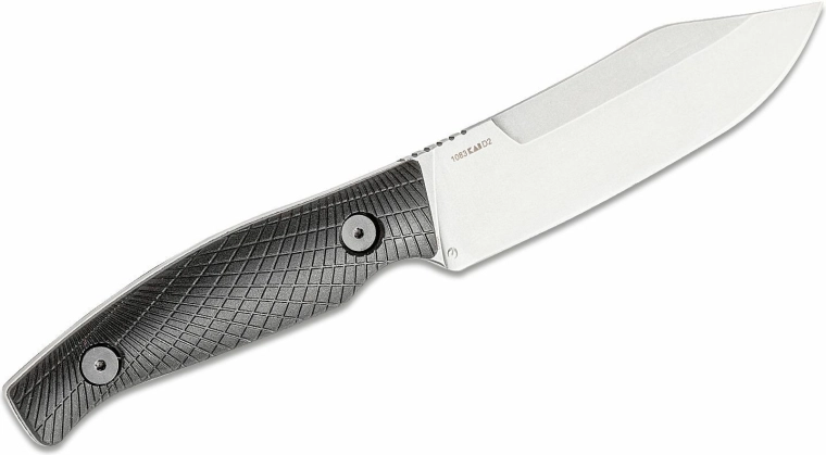 Oțelul D2, dur și tenace, cu finisaj stonewash oferă ascuțiș de durată, reflexii reduse și rezistență sporită la uzură pe teren.