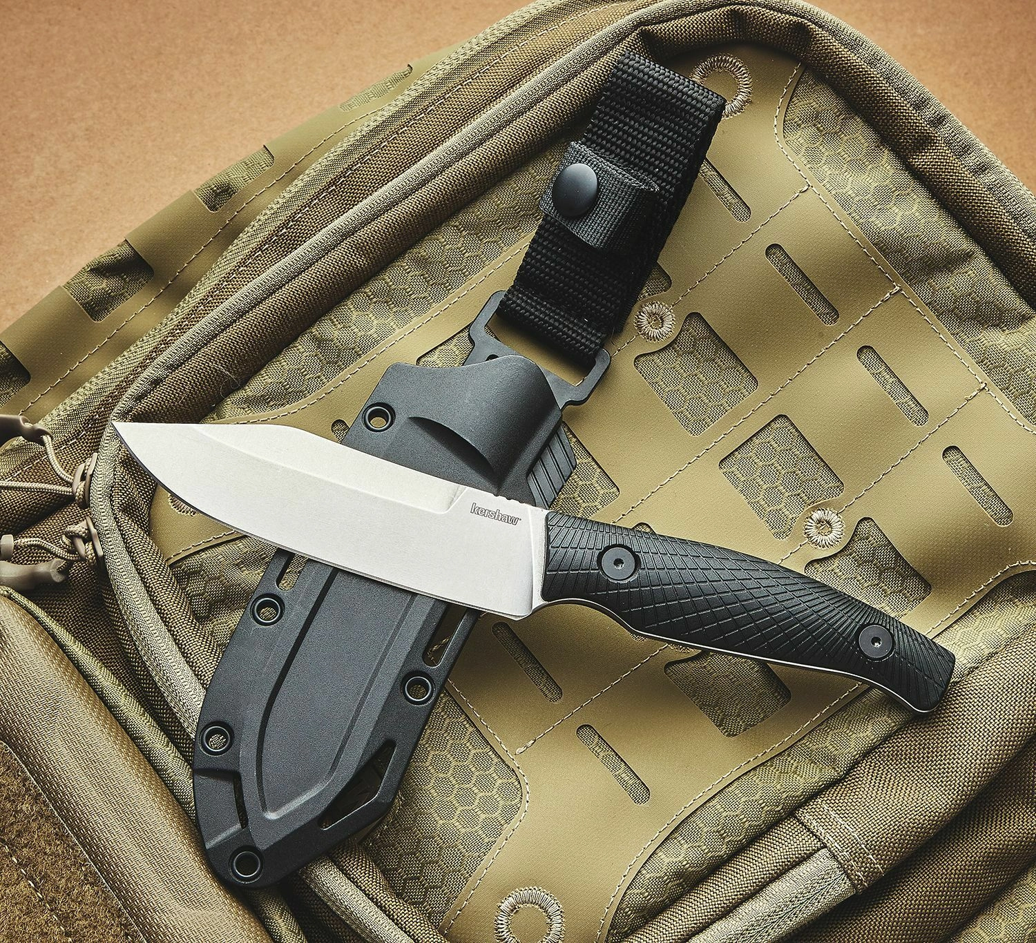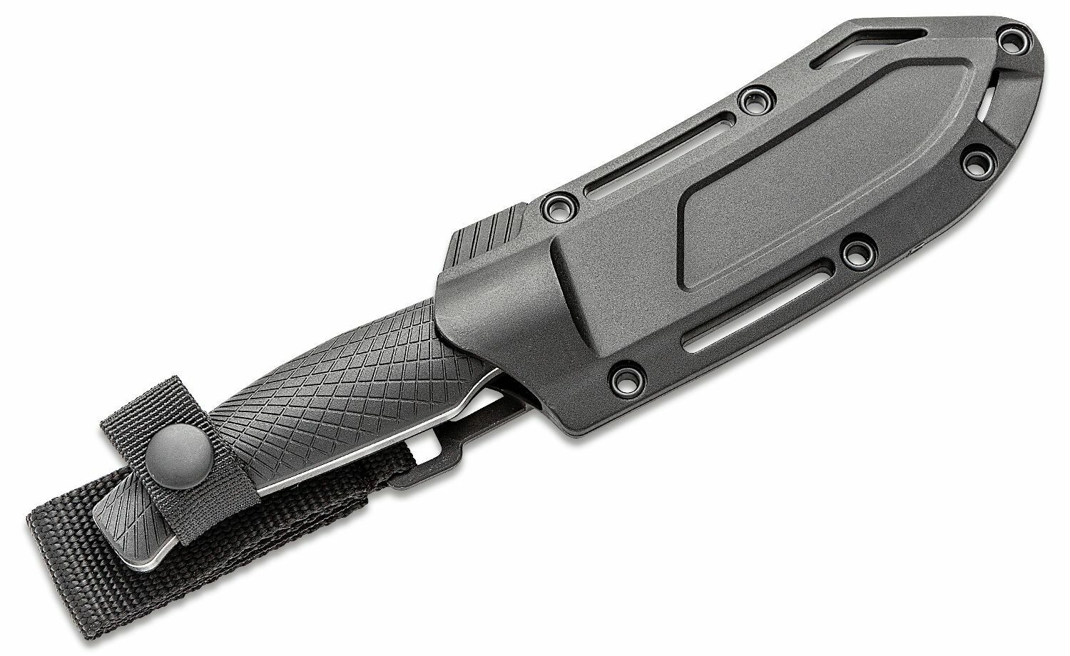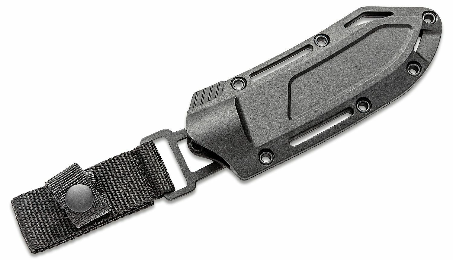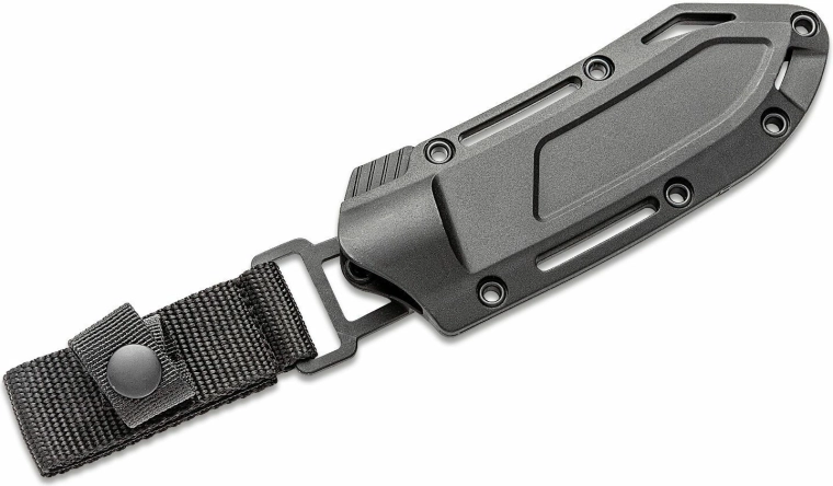 Teaca modelată din FRN cu multiple puncte de montare și siguranță din nylon menține ferm cuțitul la purtare, inclusiv în poziție cu vârful în sus.