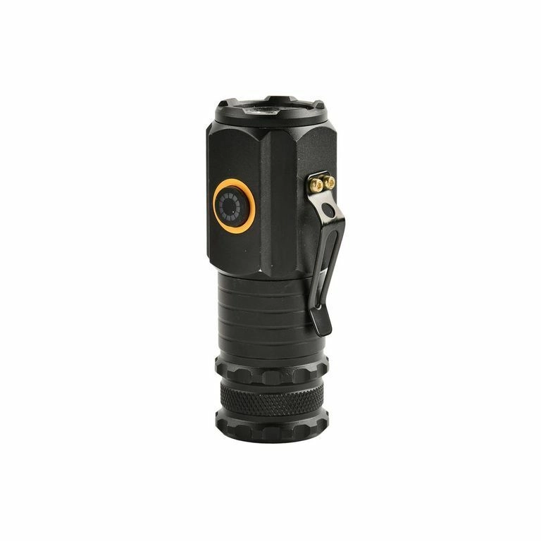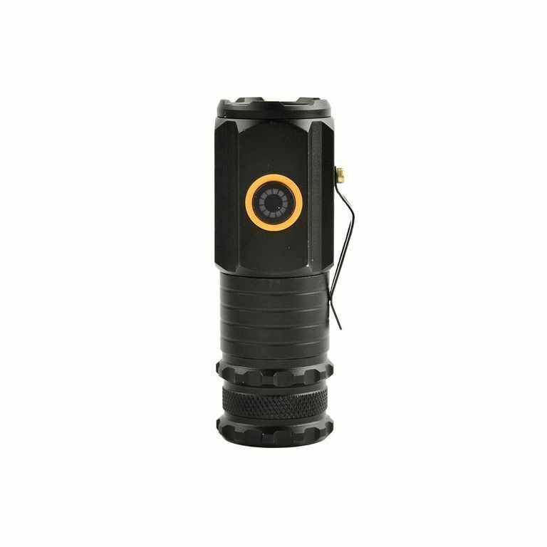 Controlul este simplu cu butonul lateral: comutare rapidă între luminozitate ridicată–medie–scăzută, stroboscop prin apăsare lungă și turbo prin dublu click. Alimentarea este asigurată de 18350 (1100 mAh) inclusă, cu încărcare prin USB‑C; indicatorul de încărcare luminează roșu. Pentru practicitate maximă există bază magnetică și clemă din aluminiu.