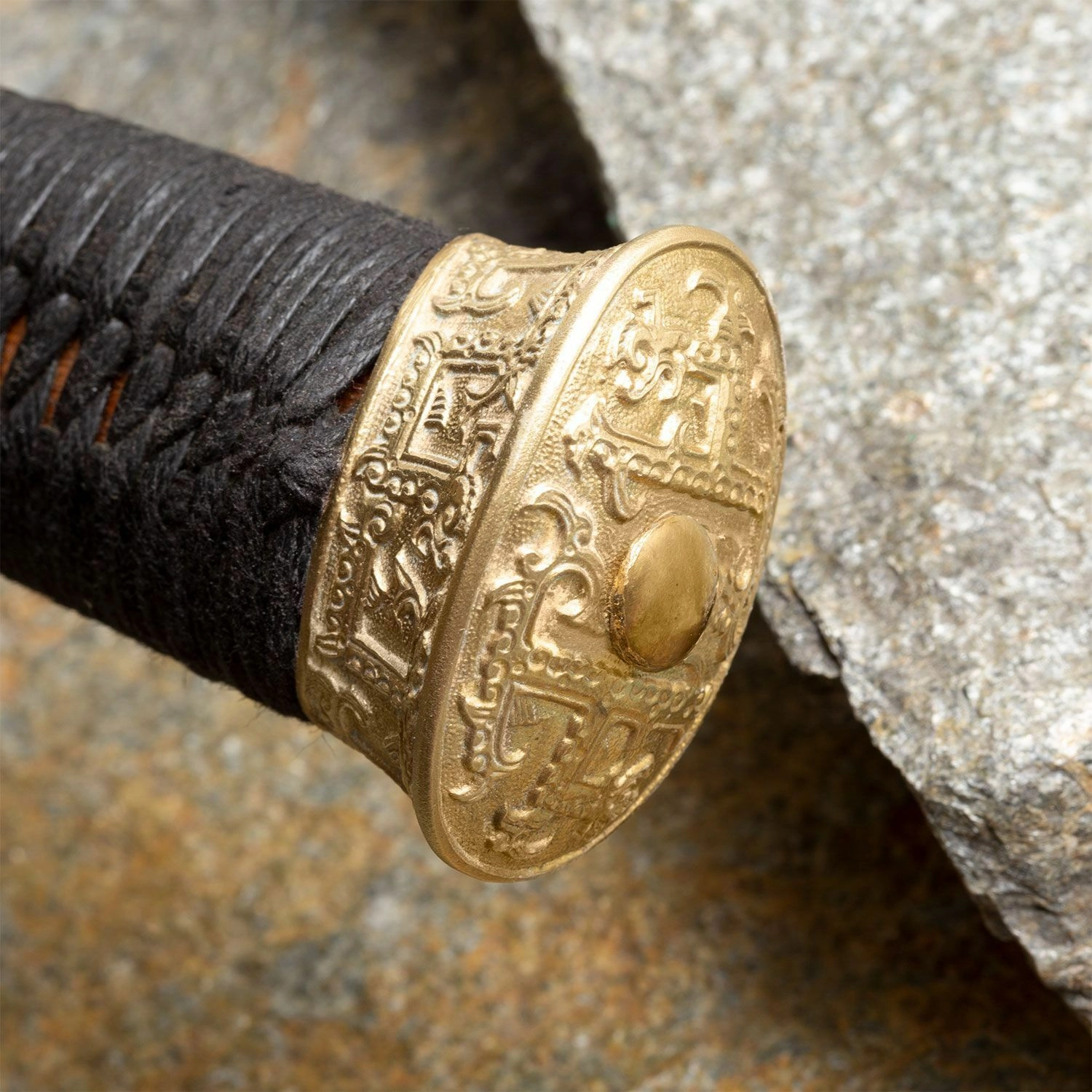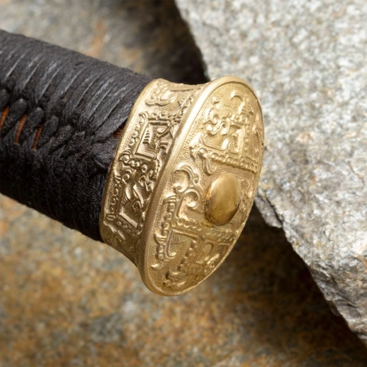 Mânerul îmbină funcționalitatea cu estetica: o gardă rotundă din alamă, cu ornament clasic gravat, protejează mâna și subliniază caracterul istoric. Nucleul din lemn tare este ferm și stabil, în timp ce împletitura neagră din mătase asigură o priză sigură și confortabilă. Pomo-ul din alamă ajută la echilibrarea întregii arme.
