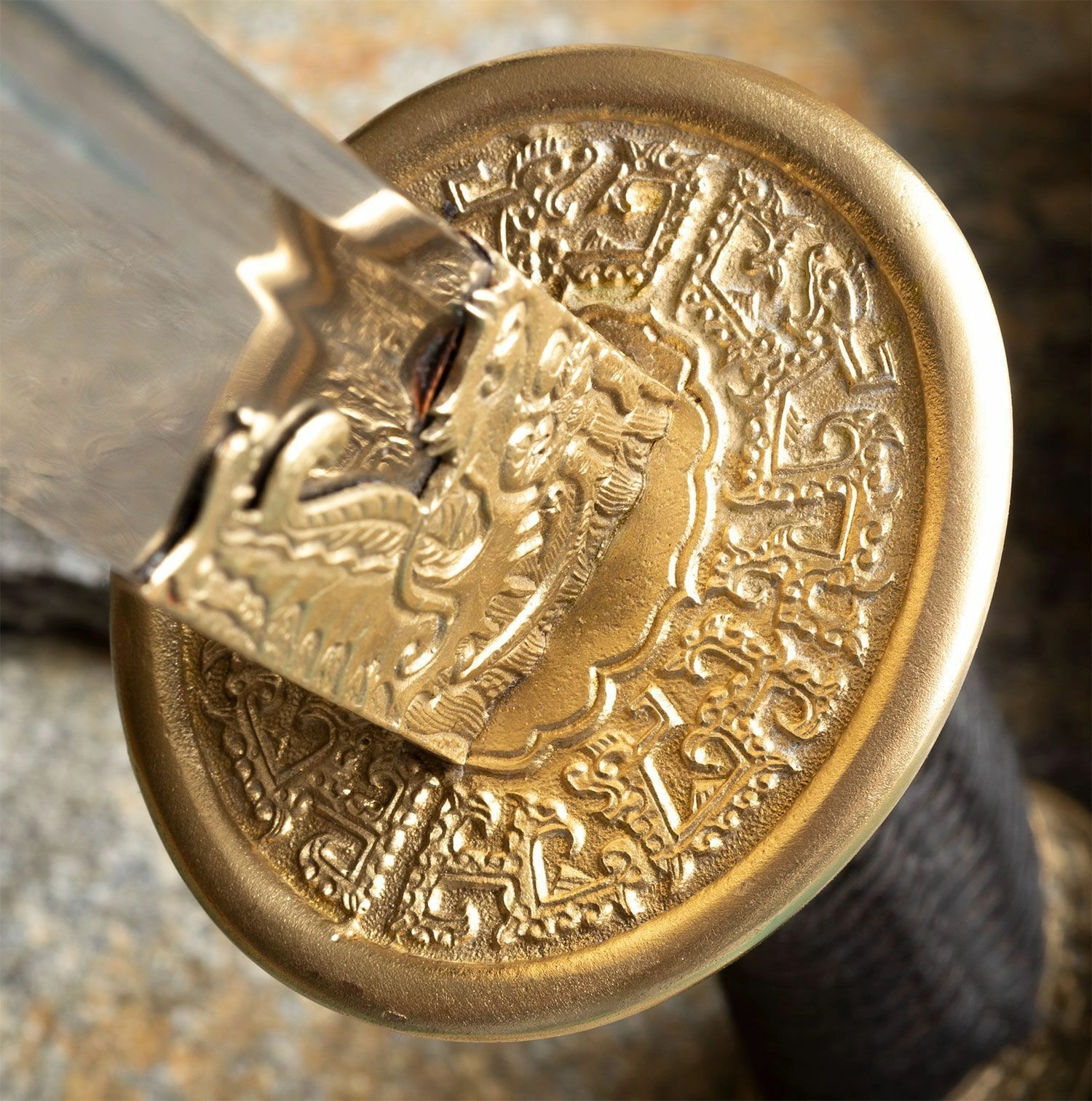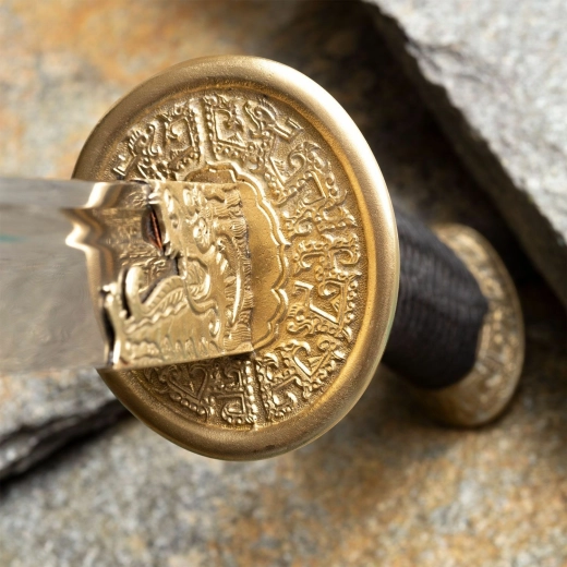 Garda ornamentală din alamă cu motiv de dragon și împletitura neagră din mătase pe mâner asigură o prindere sigură și un aspect impresionant.