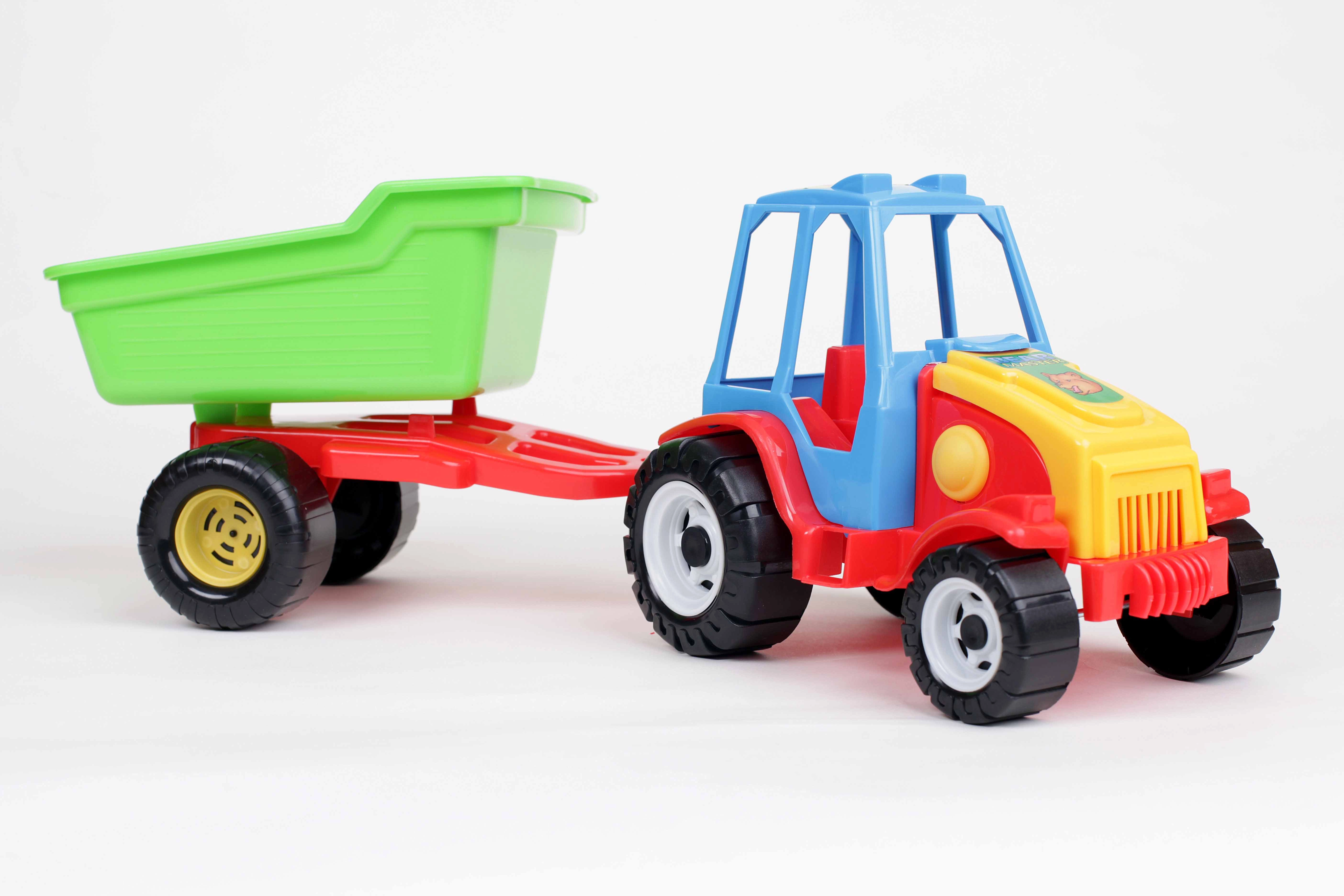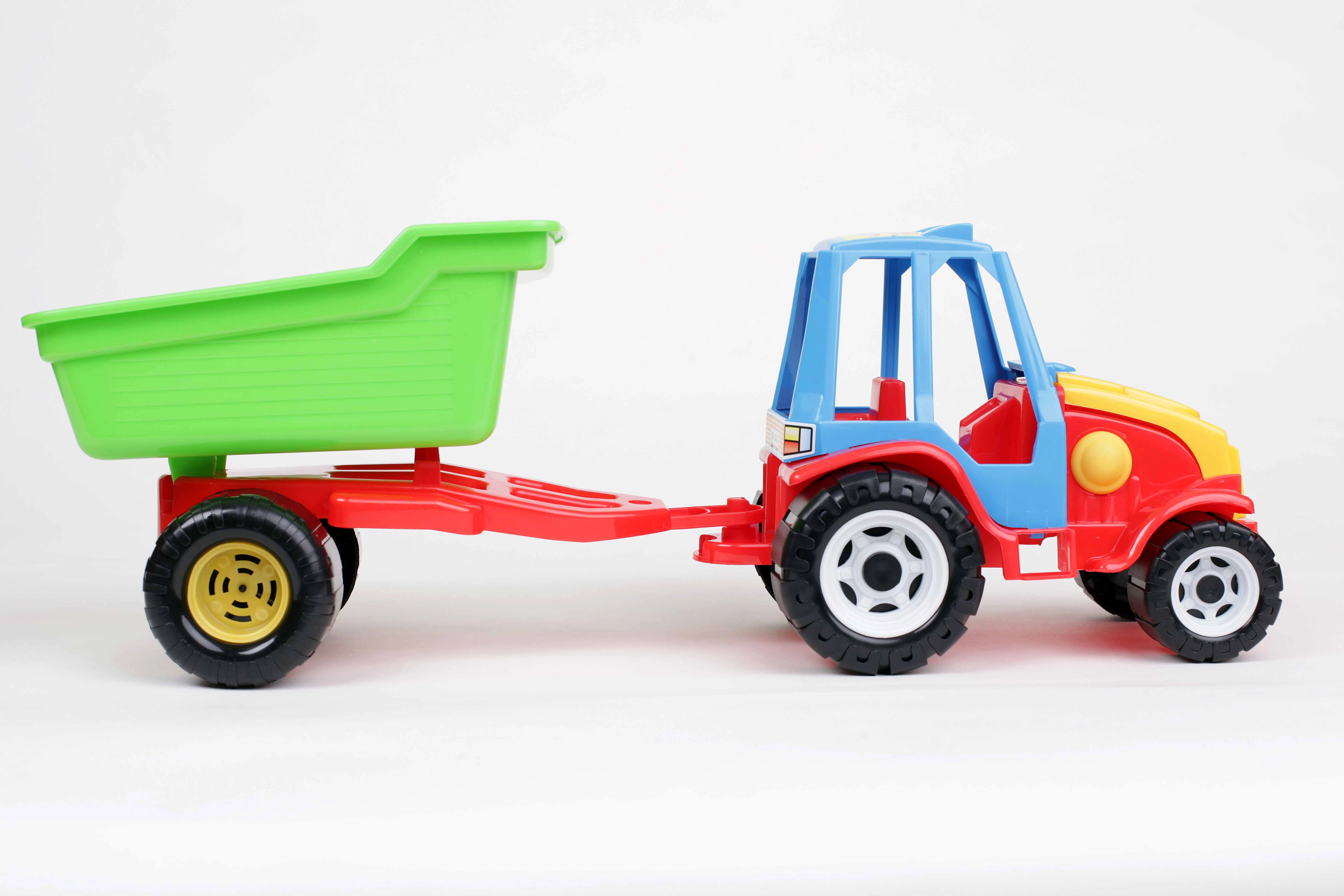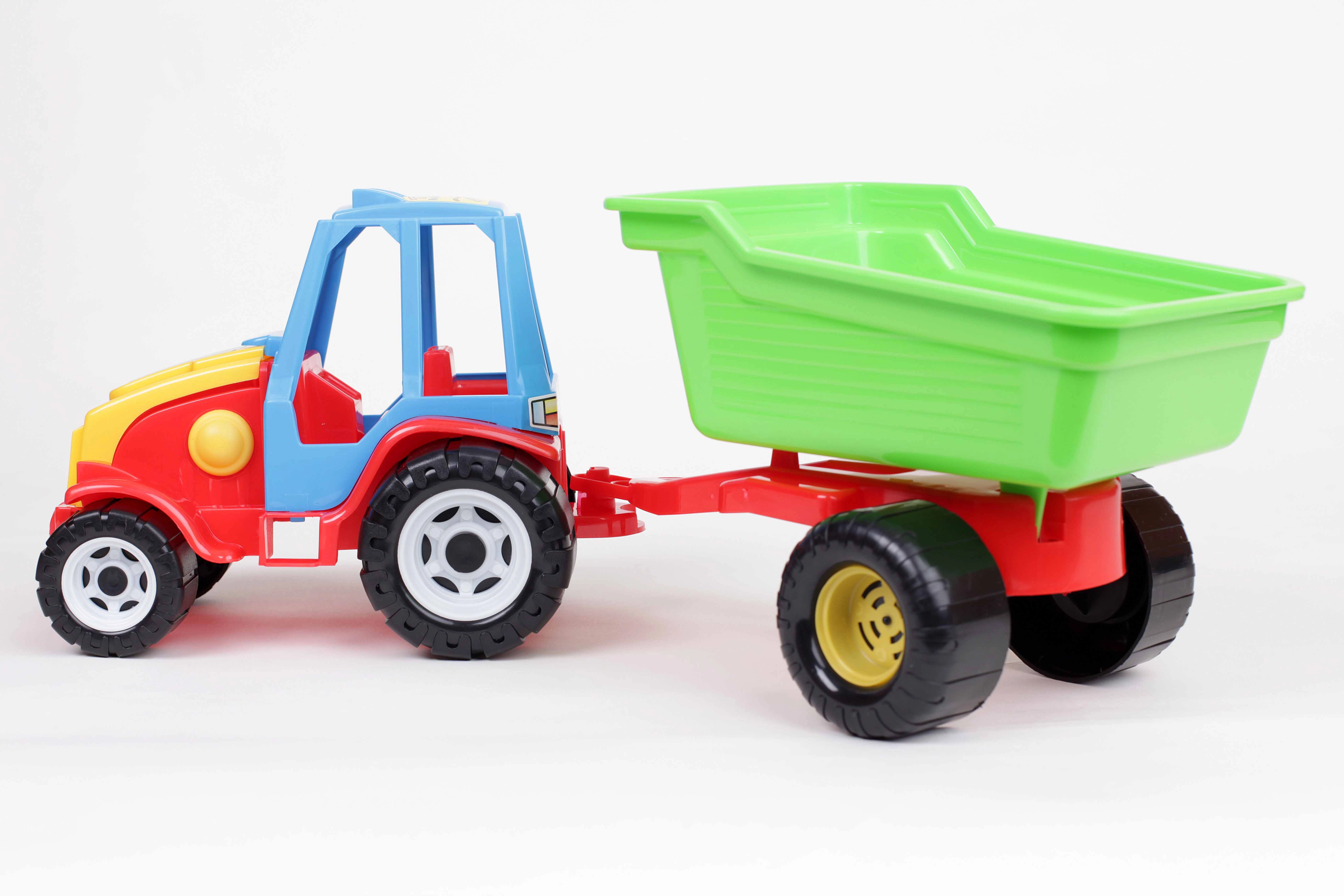 Descoperiți distracția cu un tractor stabil din plastic, cu remorcă pe o singură axă, care se poate detașa ușor și se basculează în spate. Roțile mari, negre, asigură o deplasare lină pe podea și în nisip, iar culorile atractive invită la joacă zilnică. Jucăria este realizată din materiale de calitate și sigure, fără compuși de metale grele.
