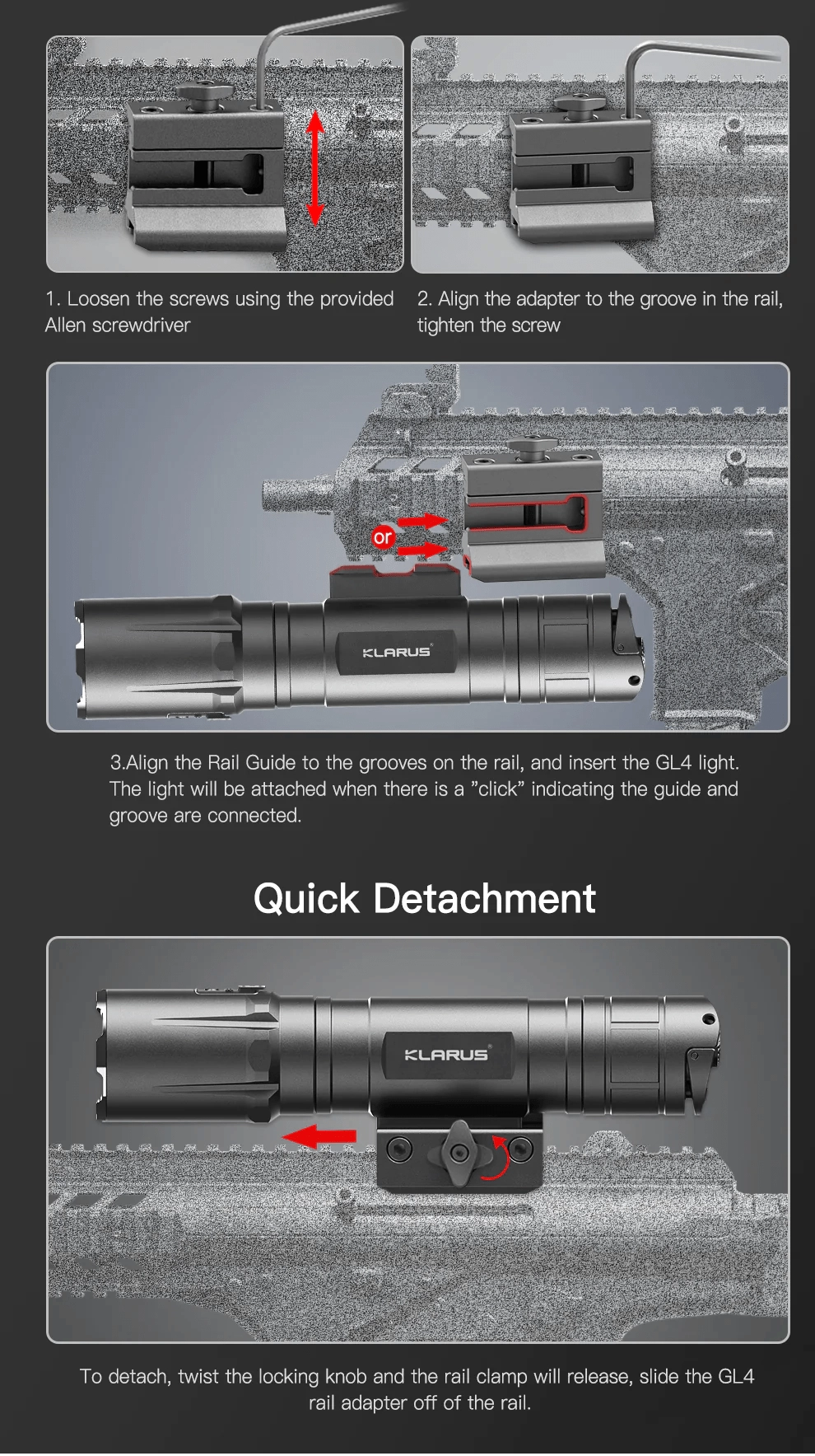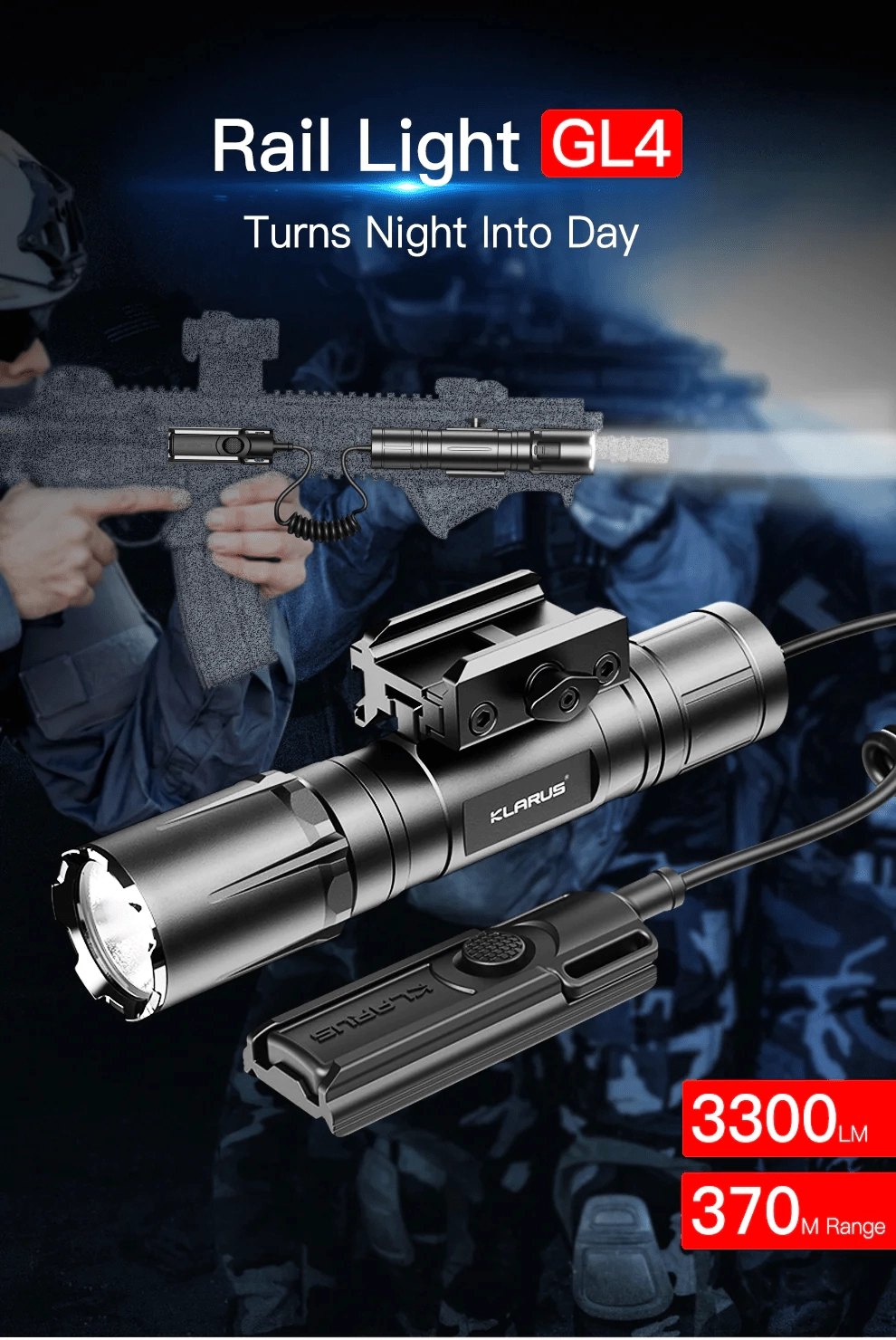 Klarus GL4 este o lanternă LED tactică robustă, concepută pentru montare pe armă și pentru utilizare outdoor solicitantă. Datorită LED‑ului Luminus și reflectorului lustruit oferă lumină albă rece 6500K, 3300 lumeni și rază de până la 370 metri. Setarea dublă tactic/outdoor și comutatorul dual permit acces instant la TURBO și stroboscop.