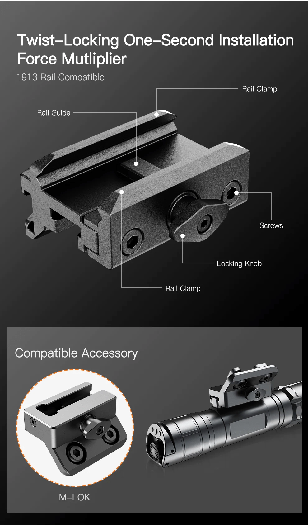 Alimentarea cu acumulator de înalt curent 21700 5000 mAh (15 A) asigură până la 375 ore de funcționare și încărcare comodă prin USB‑C. Interfața cu prindere rapidă pentru șina Picatinny garantează fixare sigură chiar și cu mănuși și în întuneric total. În pachet este inclus comutatorul cablat la distanță cu buton principal rotund (pornit/oprit, TURBO cu lumină continuă) și buton alungit pentru moduri (acționare momentană).