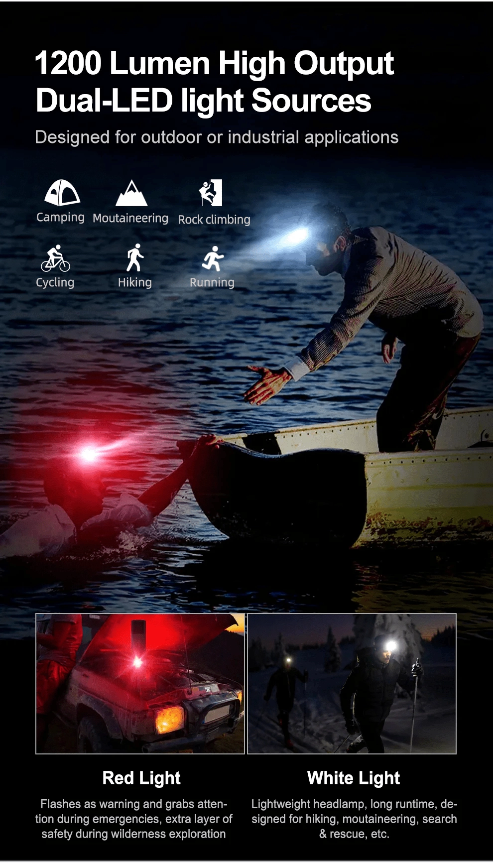 - 3 surse de lumină: LED principal (până la 1200 lm), LED lateral COB 4000K, LED roșu (lumină continuă, intermitent, SOS)