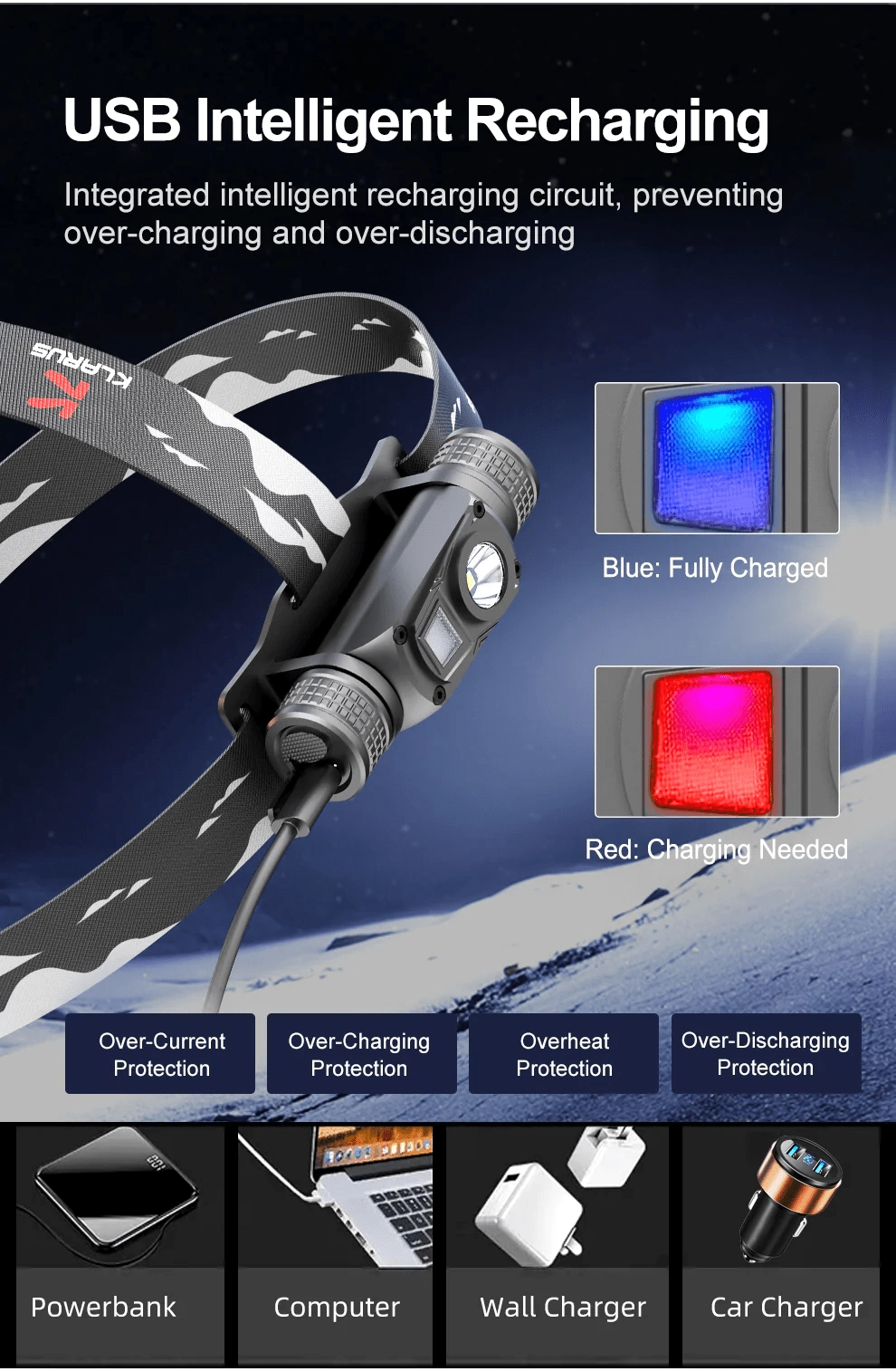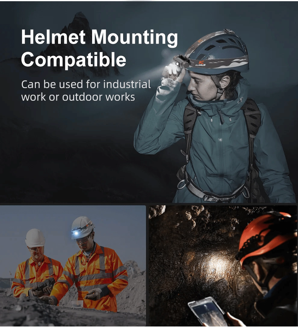 Datorită încărcării USB inteligente cu protecție la supraîncărcare și descărcare, funcționarea este sigură și fiabilă. Corpul din aluminiu aeronautic 6061‑T6 întărit rezistă la apă conform IPX6 și la căderi de 1 m. Lanterna frontală poate fi ușor scoasă din bandă și folosită ca lampă de birou.
