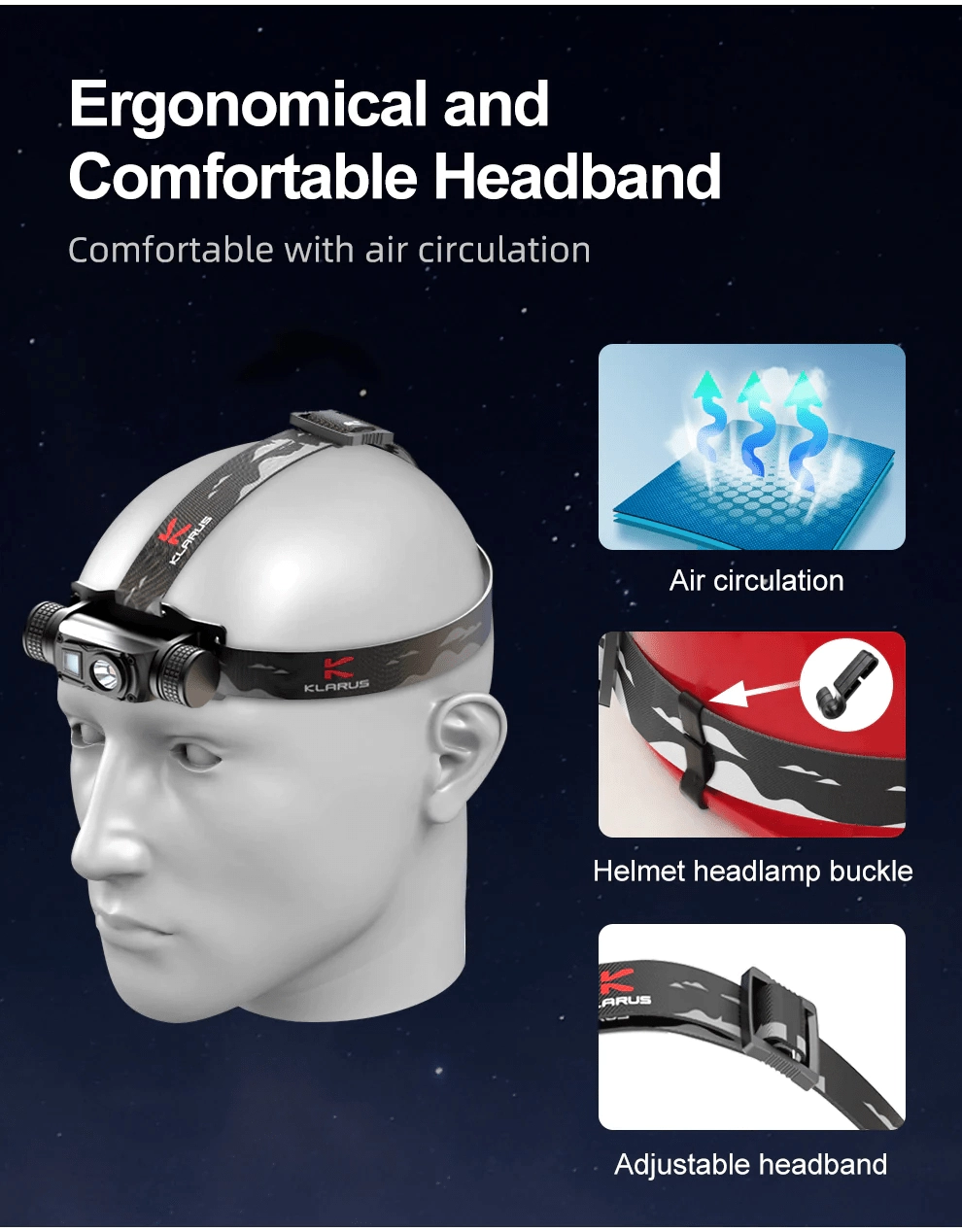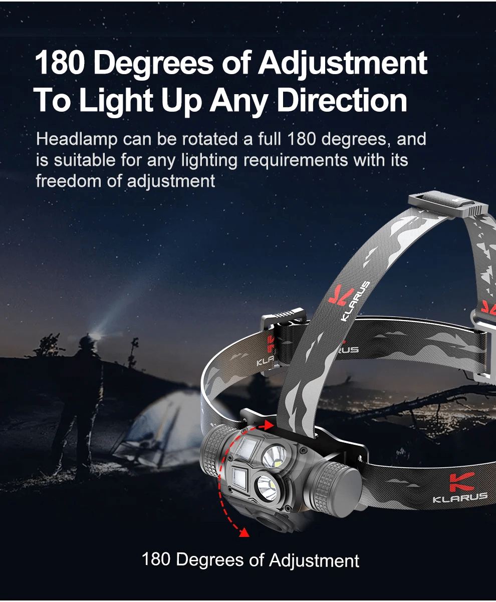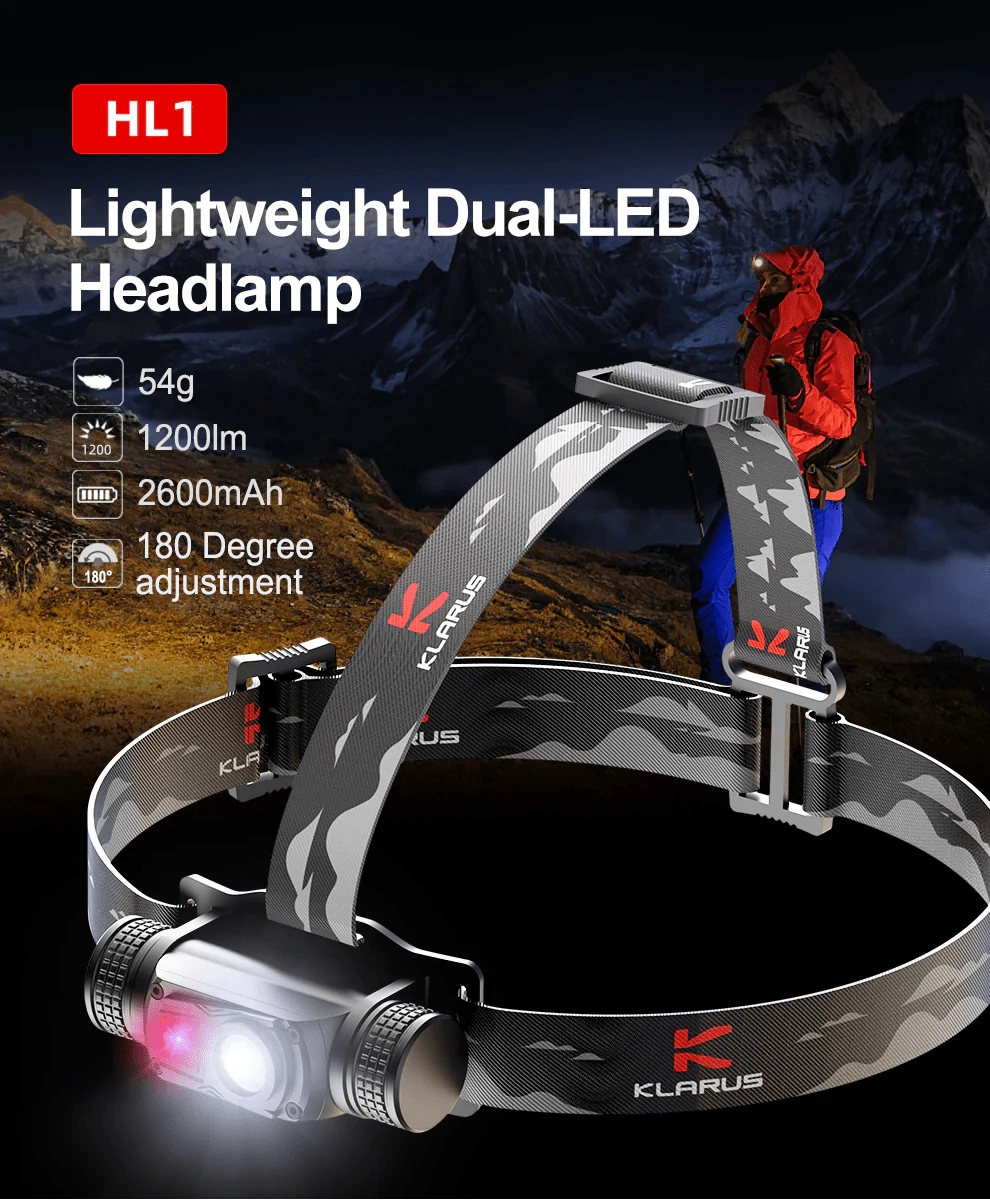 Lanternă frontală ușoară și rezistentă Klarus HL1 cu putere de 1200 lm și bătaie de 125 m, care combină fascicul îngust și larg, permite ajustarea unghiului la 180° și oferă 3 surse de lumină, inclusiv LED roșu pentru iluminare discretă. Datorită încărcării USB și bateriei 18650 2600 mAh are autonomie de până la 100 de ore. Potrivită pentru camping, drumeții, ciclism și alergare.
