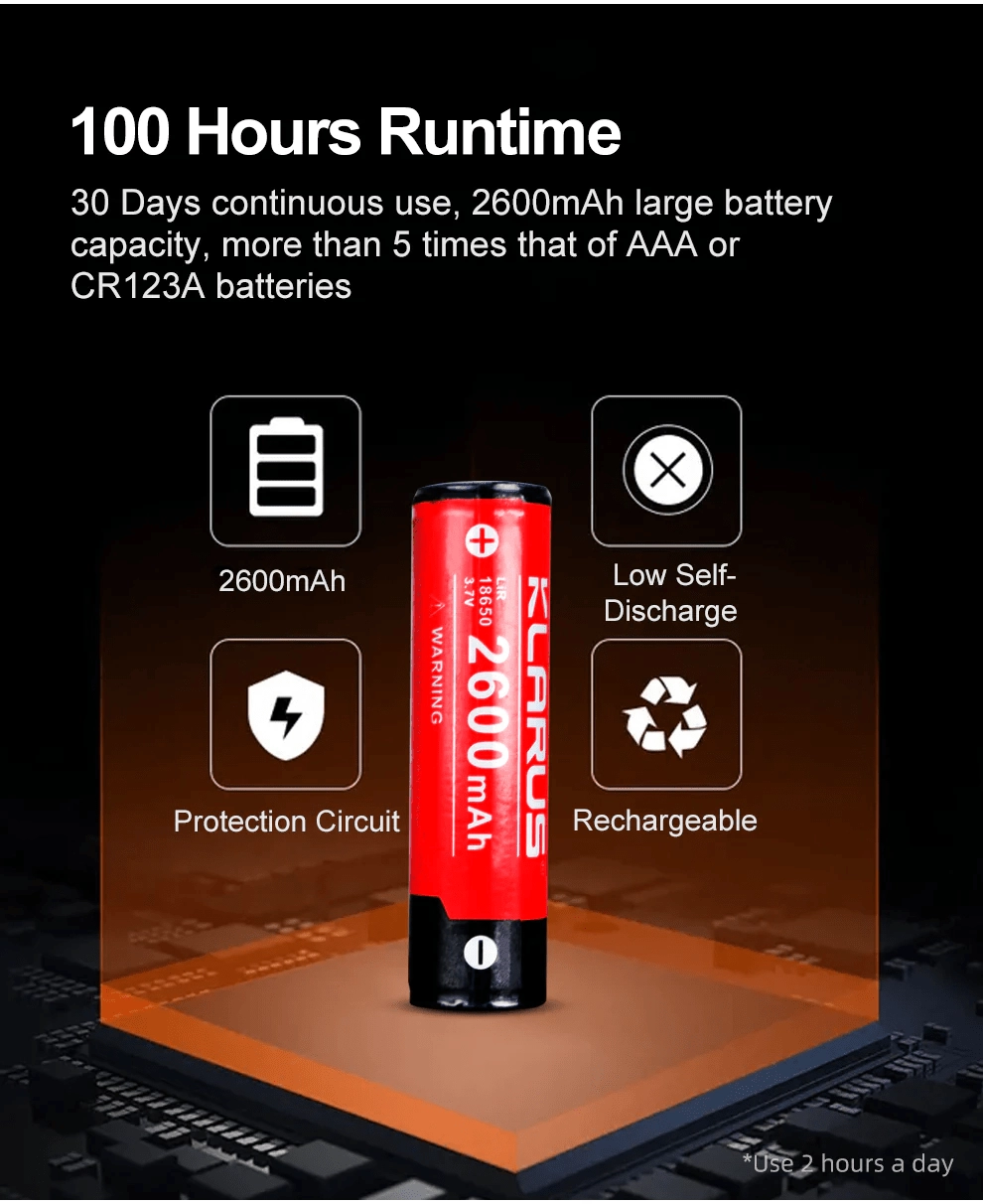 - Autonomie până la 100 de ore cu bateria 18650 2600 mAh (inclusă)