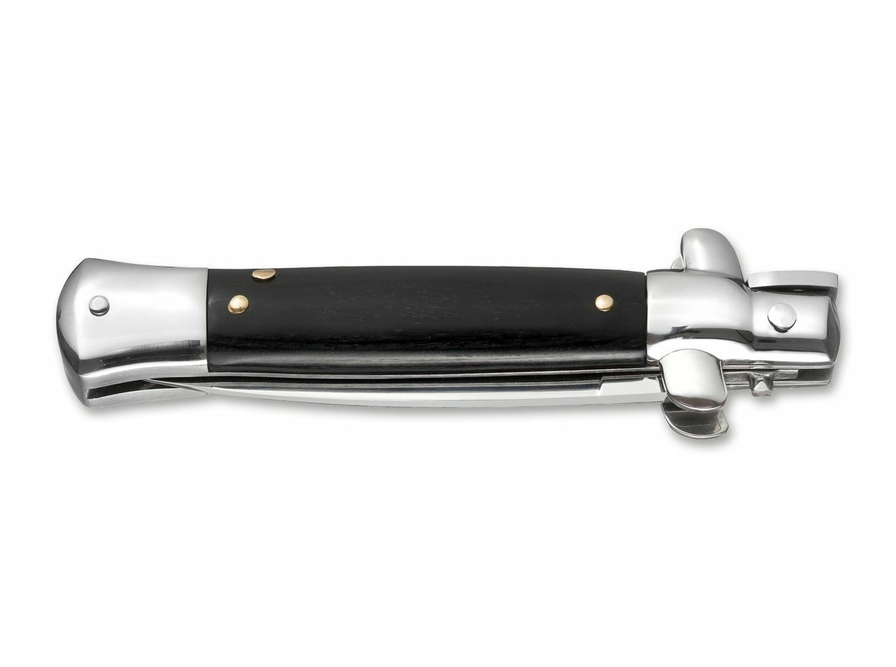 Cuțit stilet italian emblematic cu deschidere automată pentru colecționari și pasionați. Deschidere rapidă prin buton, lamă din oțel 440A cu finisaj satinat și mâner elegant din lemn Pakka închis la culoare care formează un ansamblu stilat și funcțional.