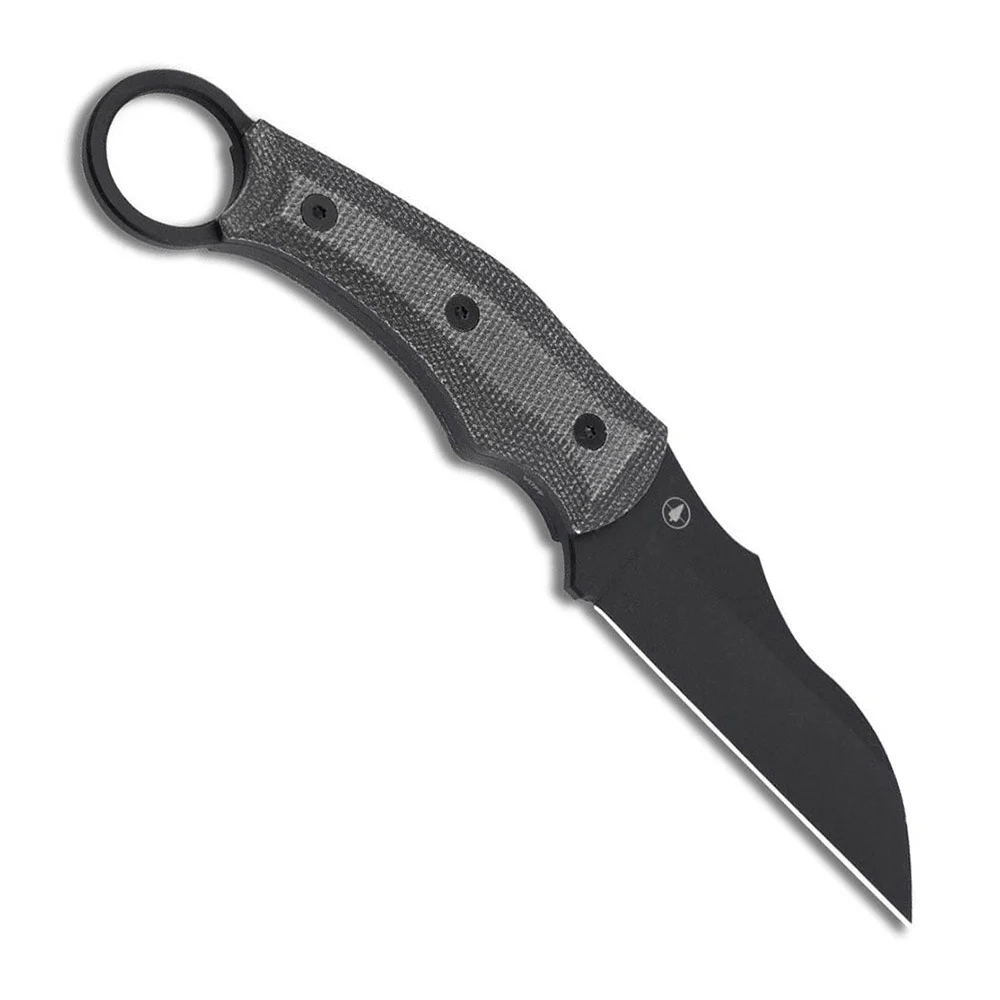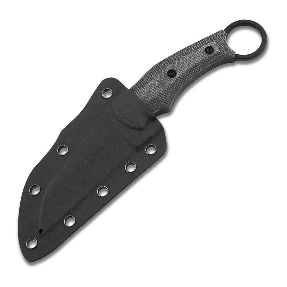 Mânerul din Micarta neagră este modelat pentru o prindere confortabilă și sigură chiar și în condiții dificile. Inelul pentru deget îmbunătățește manevrabilitatea și servește și ca orificiu pentru șnur. Teaca din Kydex cu clemă permite purtare discretă și sigură pe curea.