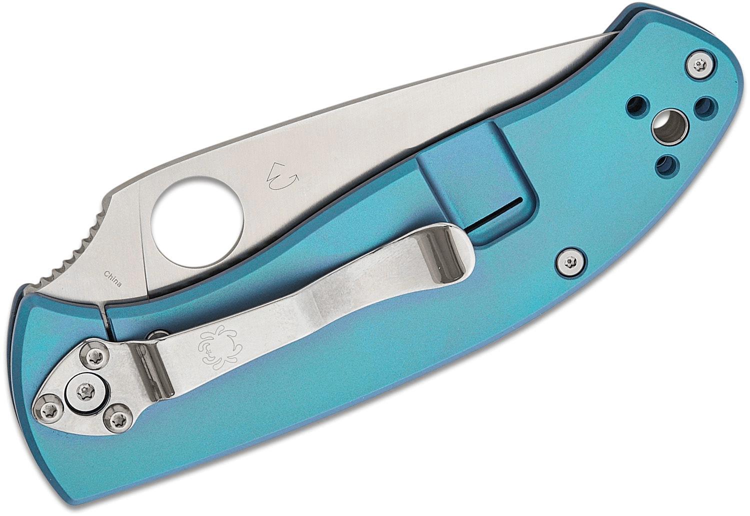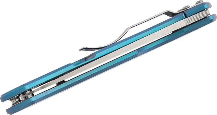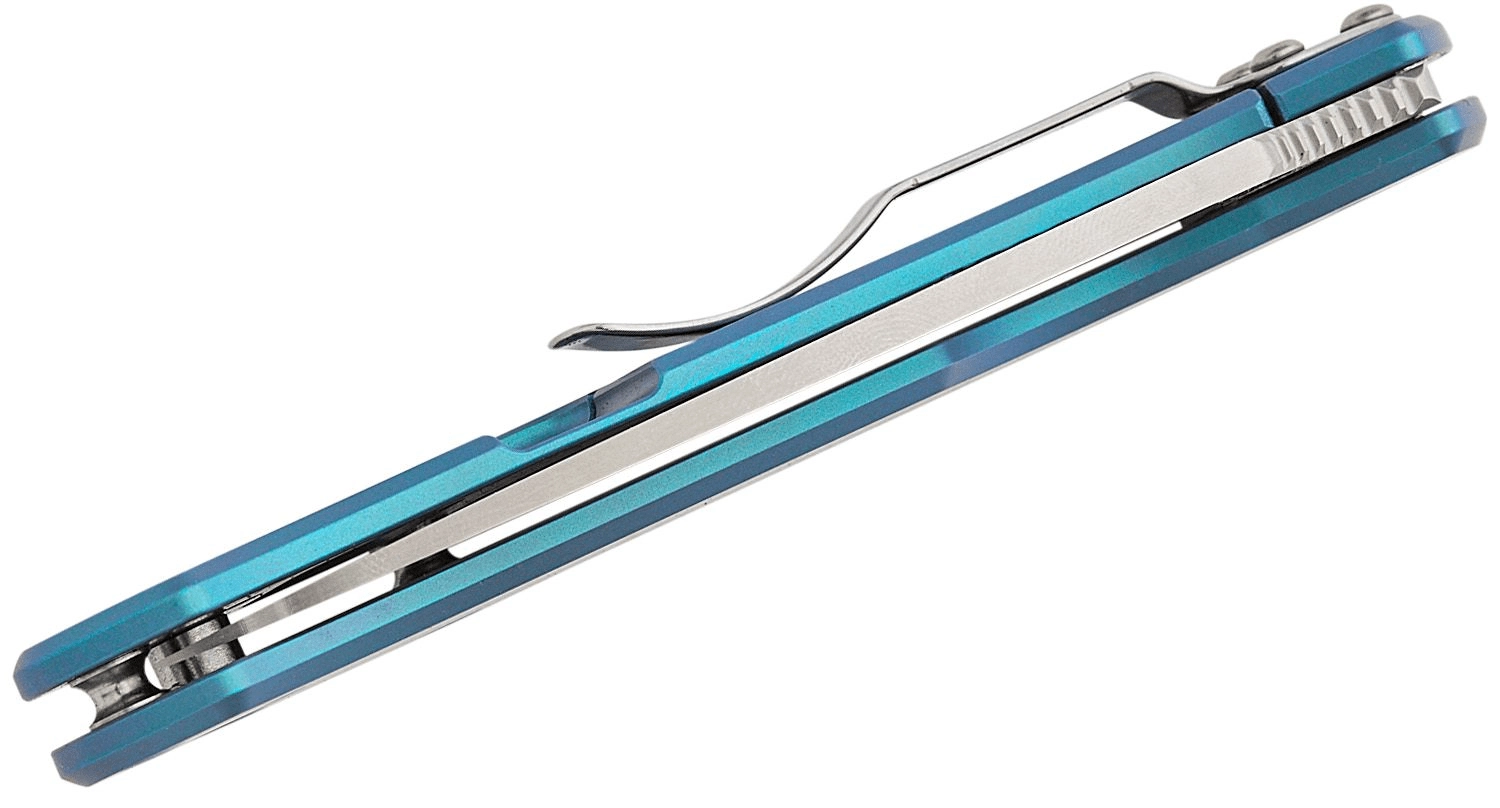 Mânerul din titan albastru este ușor, durabil și confortabil în mână. Clipsul de buzunar poate fi setat în patru poziții (tip-up/tip-down, dreapta/stânga), astfel încât îți poți adapta cuțitul exact stilului tău de purtare. Orificiul pentru șnur de la capătul mânerului facilitează asigurarea sau extragerea rapidă din buzunar.