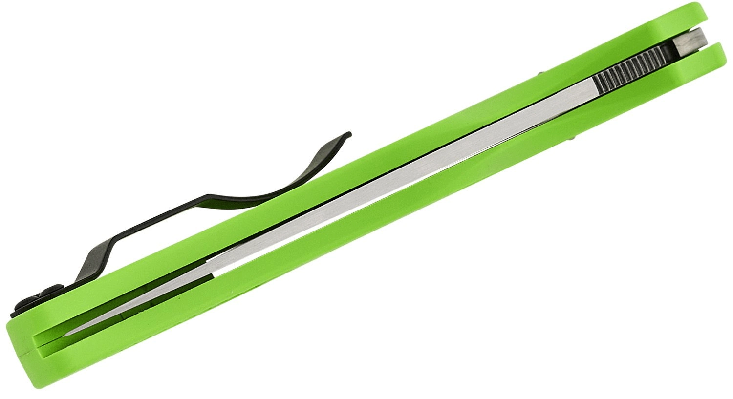 Mânerul din nailon ranforsat cu fibră (FRN) în culoare verde neon oferă priză sigură chiar și în medii umede și menține greutatea la minimum. Blocajul Back Lock asigură utilizare sigură, iar clipsul de buzunar reversibil cu patru poziții permite purtare tip-up/tip-down, pe stânga sau pe dreapta.