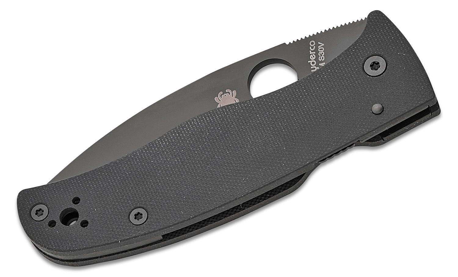 Oțelul inoxidabil premium CPM S30V, în combinație cu finisajul DLC, asigură o retenție excelentă a tăișului și rezistență sporită la coroziune și abraziune. Deschiderea prin orificiul pentru degetul mare SpyderHole este rapidă și intuitivă, iar Compression Lock pe spatele mânerului garantează blocarea sigură și fiabilă a lamei.