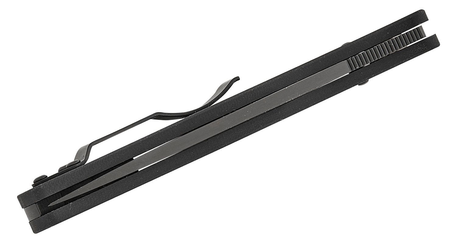 Mânerul din G10, fixat ferm pe plăsele din oțel, oferă o priză sigură chiar și în condiții mai dificile. Clipsul metalic reversibil permite purtarea tip-up atât pe stânga, cât și pe dreapta, iar orificiul pentru șnur extinde opțiunile de asigurare sau personalizare.