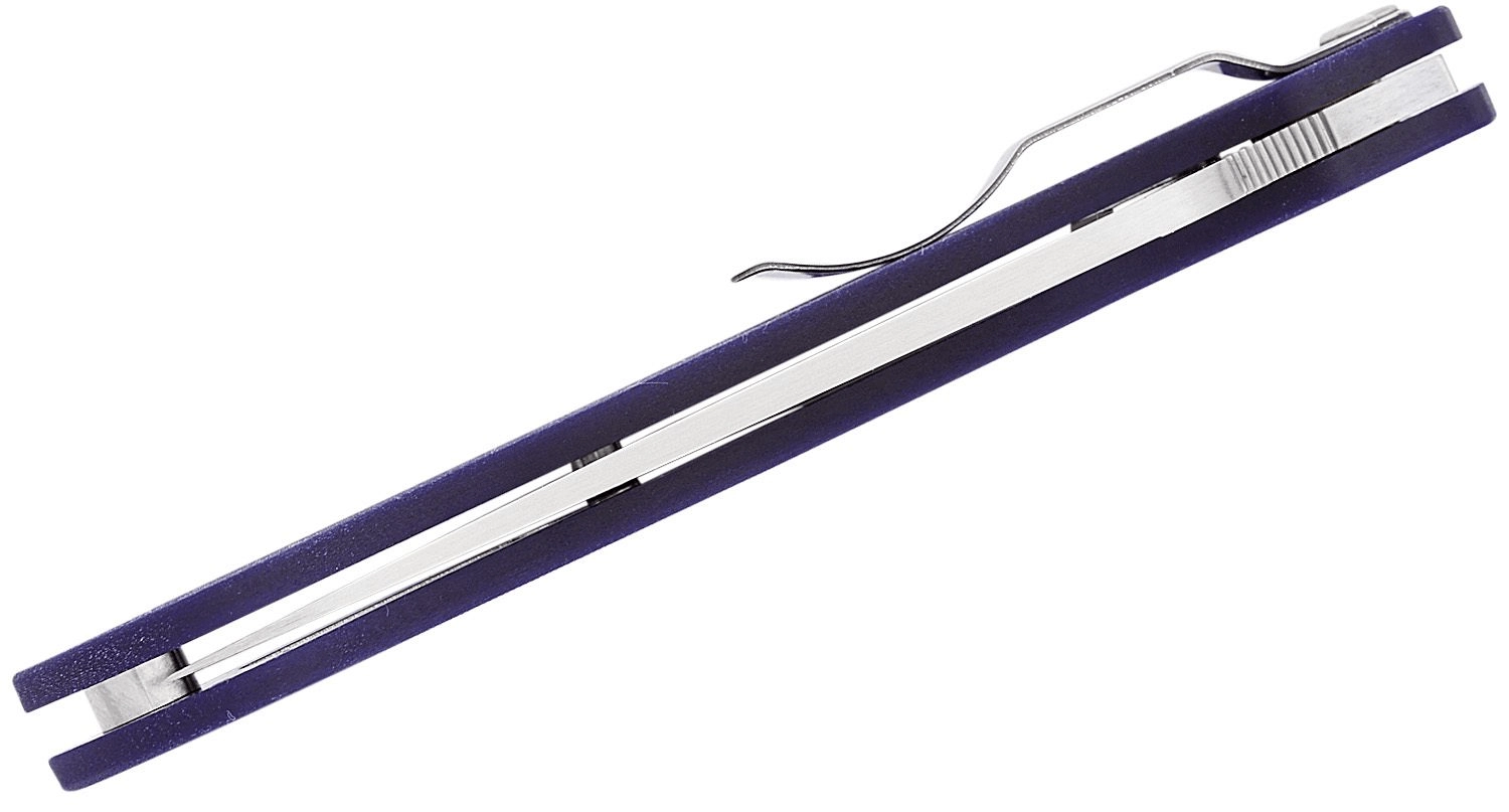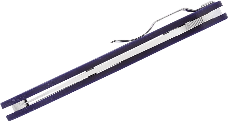 Compression Lock patentat sporește rezistența blocării și asigură închiderea în siguranță fără a introduce degetele pe traseul lamei. G10 texturat, în culoare albastru închis, este extrem de durabil și oferă priză sigură în aproape orice condiții.