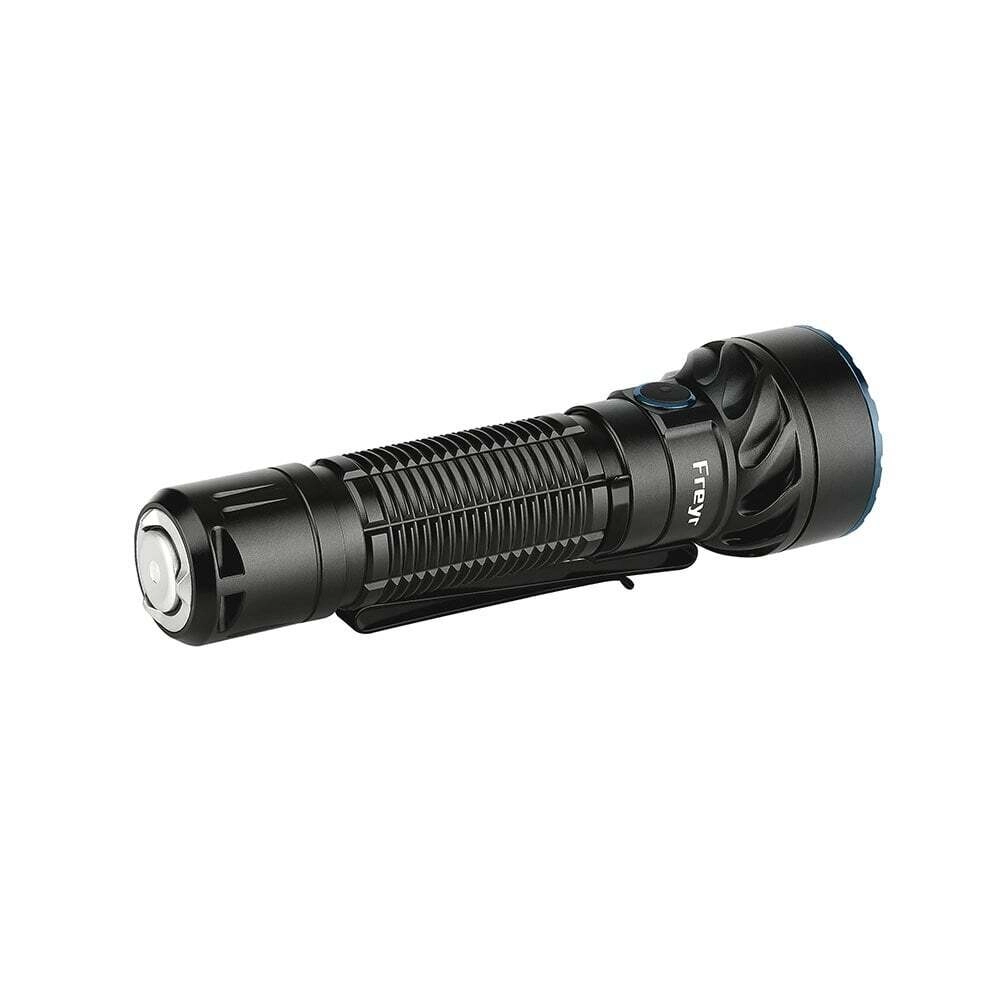 Olight Freyr este o lanternă multicoloră performantă, cu control dual, care combină lumină albă de până la 1750 lm cu moduri RGB (roșu, verde, albastru) pentru utilizare versatilă în aer liber și în situații tactice. Oferă rază de acțiune de până la 360 m, încărcare magnetică, sensor de proximitate pentru funcționare în siguranță și autonomie lungă la o singură încărcare.