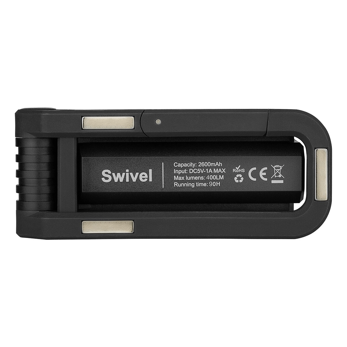 Bateria Li‑ion integrată de 2600 mAh se încarcă prin USB‑C, iar indicatorul de stare în patru trepte monitorizează capacitatea rămasă. Suportul rabatabil la 180° servește ca mâner și agățătoare, iar magneții puternici permit fixare fără contact pe suprafețe metalice. Astfel poți regla ușor lumina la unghiul ideal pentru lucru.