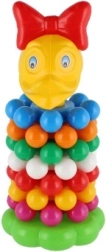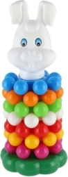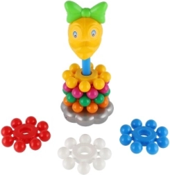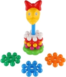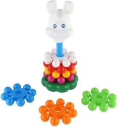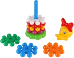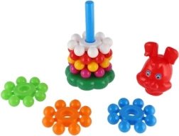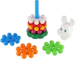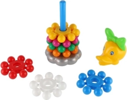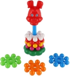 Această piramidă jucăușă din plastic, cu inele, este prima jucărie didactică ideală pentru cei mici. Copiii prind ușor inelele și le stivuiesc pe tijă, exersând în mod natural motricitatea fină, abilitățile de coordonare și diferențierea culorilor și mărimilor. Datorită înălțimii de 26 cm, turnul este stabil, bine vizibil și îi invită la încercări repetate.