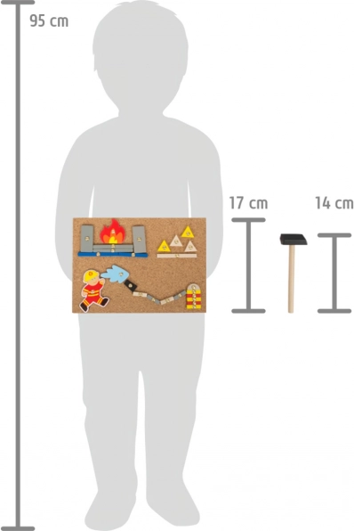 Acest joc creativ de bătut este alegerea ideală pentru copiii care iubesc activitățile de creație și universul pompierilor. Datorită sistemului simplu de piese cu orificii pre-găurite și ciocănelului din lemn sigur, copiii își pot compune cu ușurință propriile motive pe placa din plută sau pot folosi cardurile incluse, cu două fețe, cu propuneri de modele.