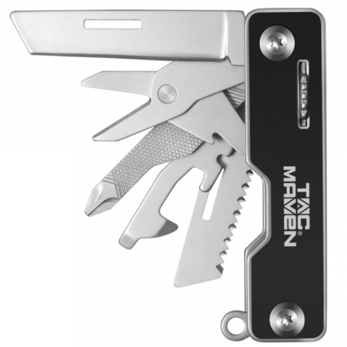 Lama, foarfecă, ferăstrău, pilă pentru unghii, desfăcător de conserve și sticle, șurubelniță în cruce și plată, precum și inel pentru chei – toate într-o singură unealtă.
