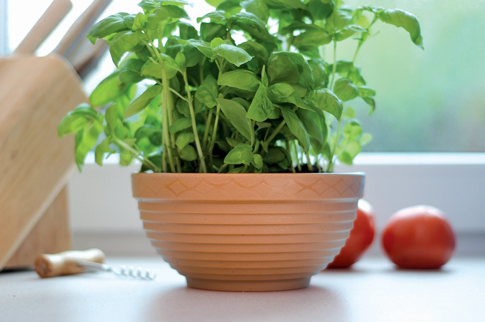 Bolul lat și puțin adânc este perfect pentru cultivarea busuiocului și a altor ierburi pe pervaz sau pe blatul din bucătărie.