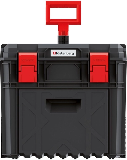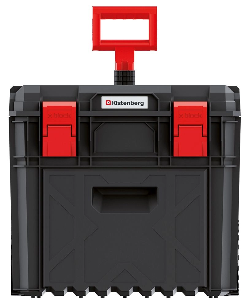 Troler profesional pentru unelte X-BLOCK PRO cu construcție robustă, mâner telescopic și roți mari pentru transport facil. Oferă conectare modulară cu alte boxuri, etanșare împotriva prafului și apei și capacitate de încărcare până la 50 kg pentru depozitarea în siguranță chiar și a uneltelor grele.